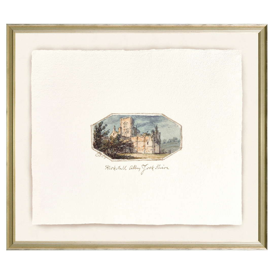 Beautiful miniature watercolours over graphite on cream wove paper, depicting English country seats, abbeys, and castles. Shown in high relief with a drop shadow to give the illusion of a three-dimensional paper.