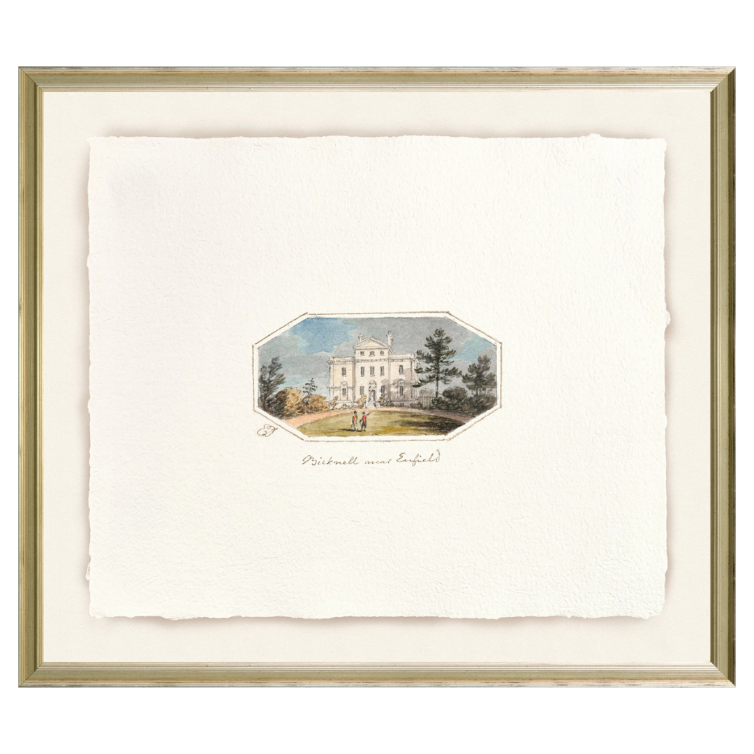 Beautiful miniature watercolours over graphite on cream wove paper, depicting English country seats, abbeys, and castles. Shown in high relief with a drop shadow to give the illusion of a three-dimensional paper.