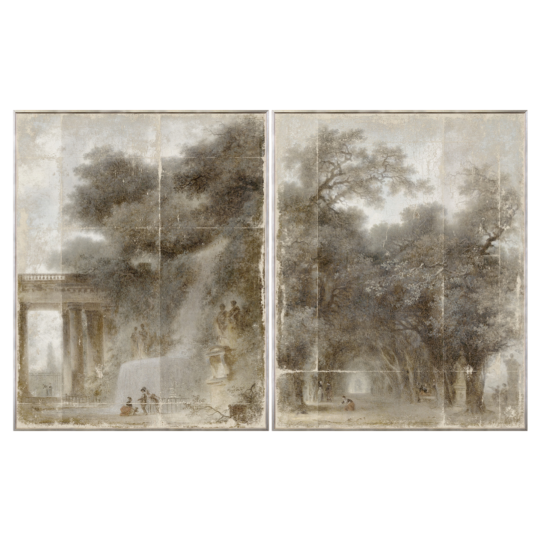 This romantic pair of landscapes are rendered in soft neutral tones of gold, grey and taupe. The French artist Jean Honore Fragonard was a master of light and shadows. The figures and statuary are dwarfed dramatically by the use of overarching trees or columns. The beautifully distressed appearance of these classic pieces creates a grand impression.