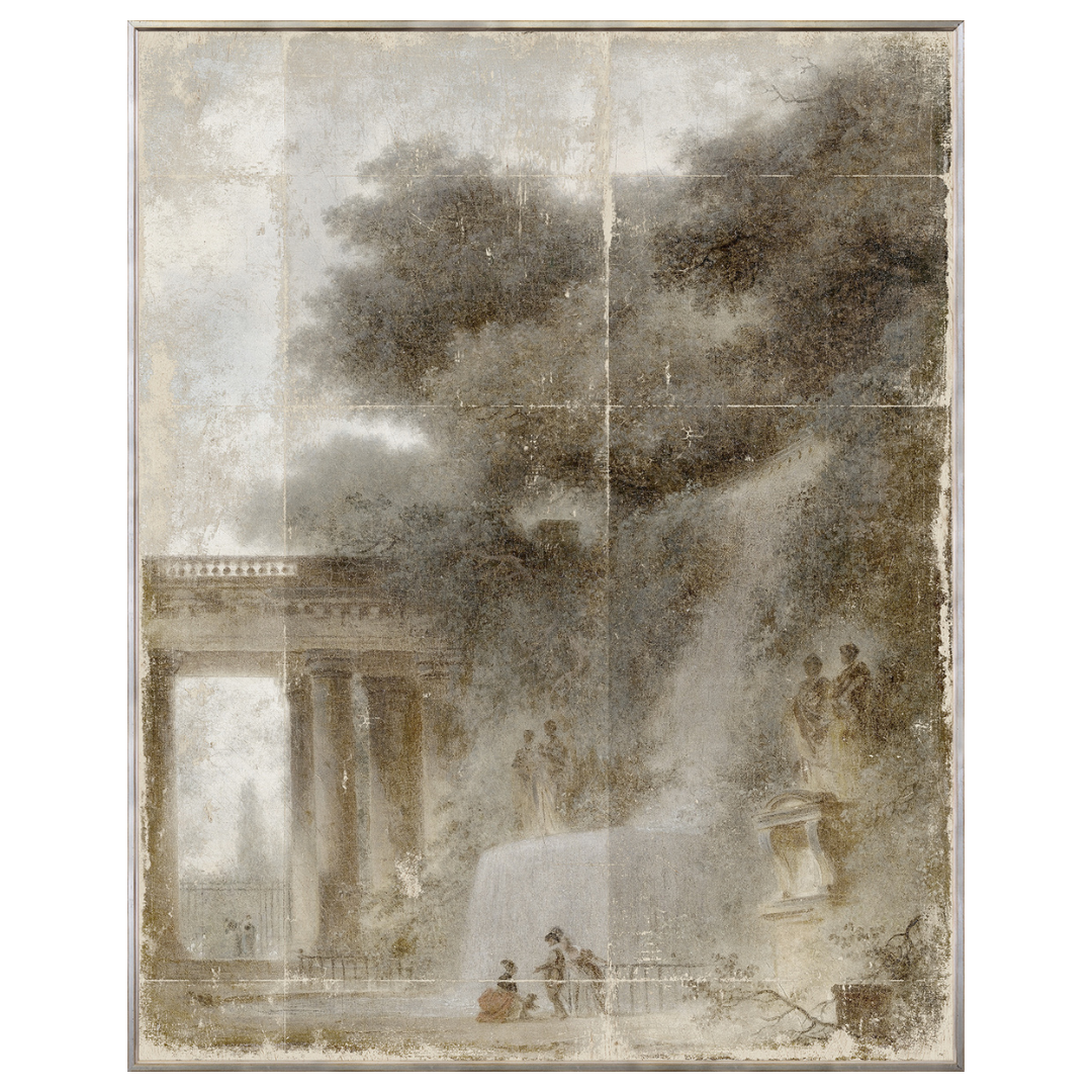This romantic pair of landscapes are rendered in soft neutral tones of gold, grey and taupe. The French artist Jean Honore Fragonard was a master of light and shadows. The figures and statuary are dwarfed dramatically by the use of overarching trees or columns. The beautifully distressed appearance of these classic pieces creates a grand impression.