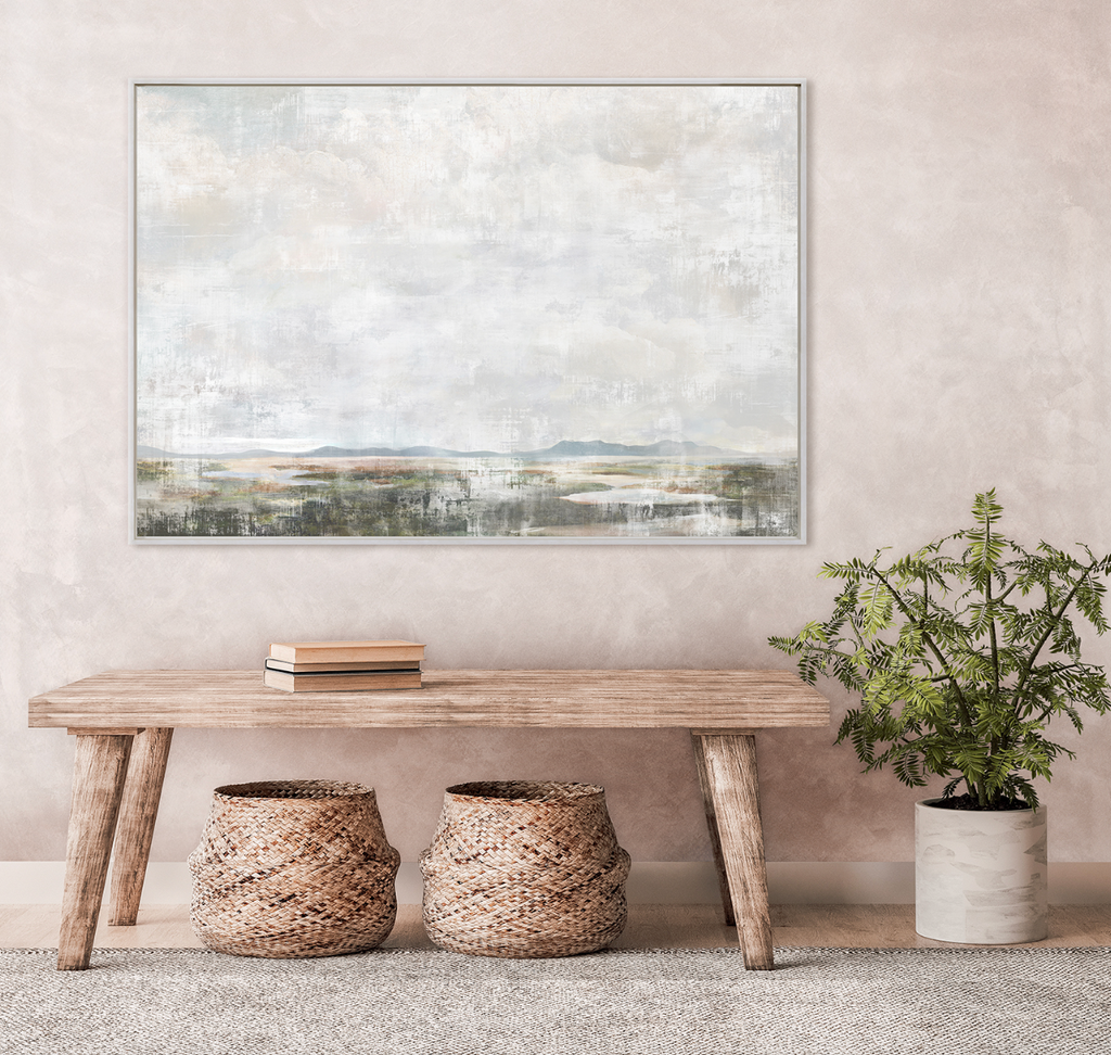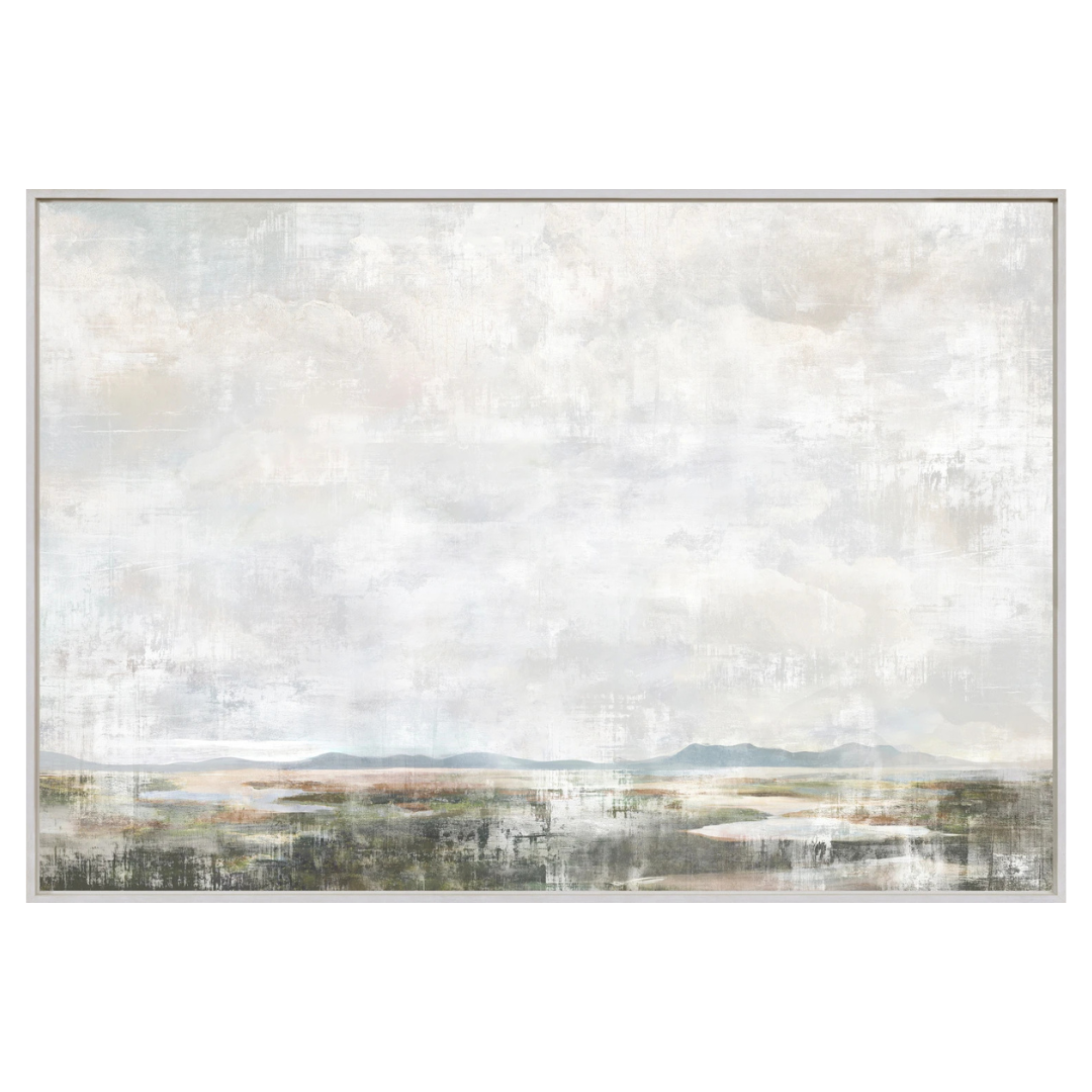 An impressionist landscape with soft, dreamy tones of green, camel, blue, and grey, creating a blend between land and sky. White textured elements give the images a weathered look.