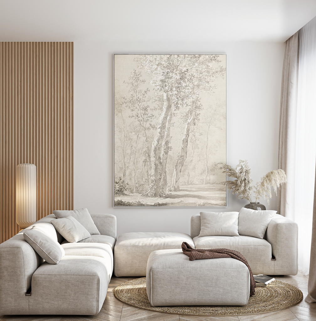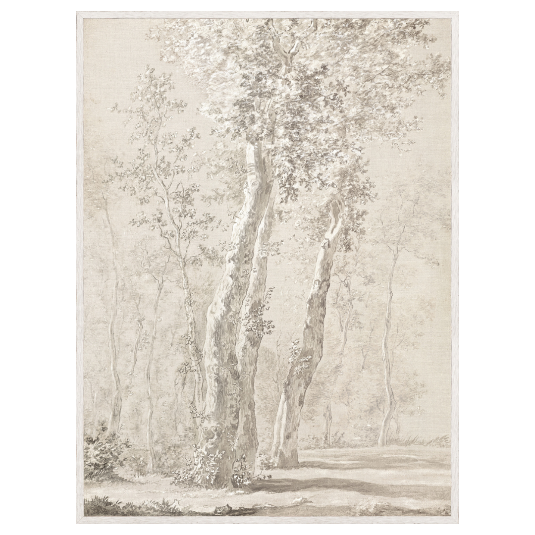 A pencil drawing from the early 19th century on a woven linen ground with gouache highlights. This dreamy drawing of sunlit trees is a play of light and shadow. The trees appear to glow in the sun as the light hits their bark, creating a strong sense of dimension. The subtle presence of trees and branches in the distance shows a real sense of space and helps bring the viewer into the piece.