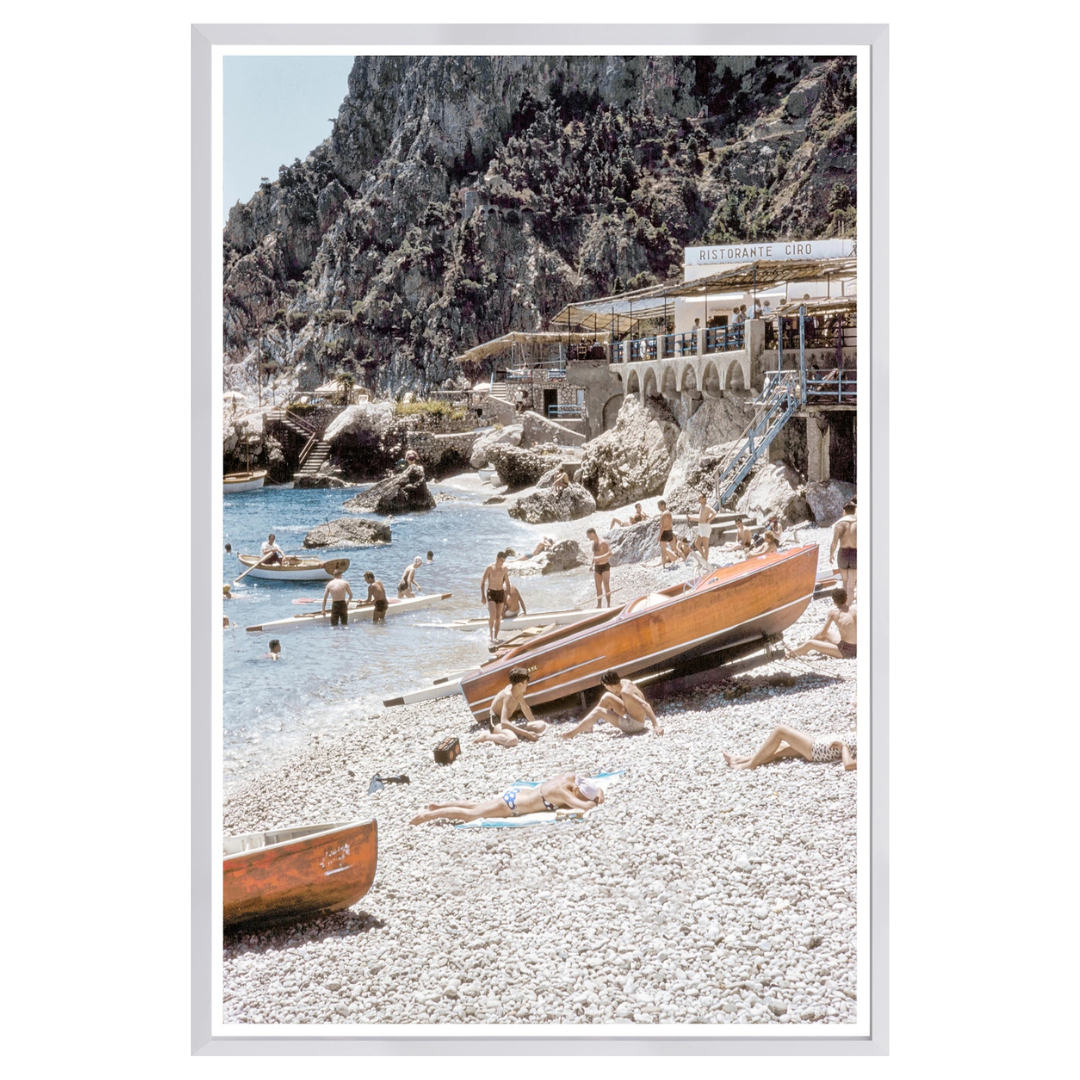 A sun-soaked, busy beach shore is bustling with activity in this beautiful nostalgic photograph.