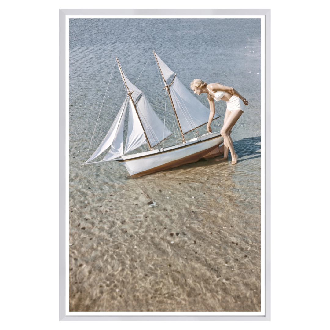 In this nostalgic photograph from the late 1940s, a model moves a schooner through the shallows of a sandy beach. The subdued colours and tones of blue, white, and taupe make for a harmonious image.