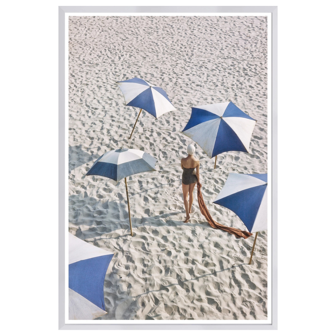 Characteristic of Frissell’s style, this photograph features a swimsuit model in motion from a unique angle. The arrangement of umbrellas surrounding her makes an interesting composition and leads the viewer’s eye through the image, following the path it seems the model is taking.