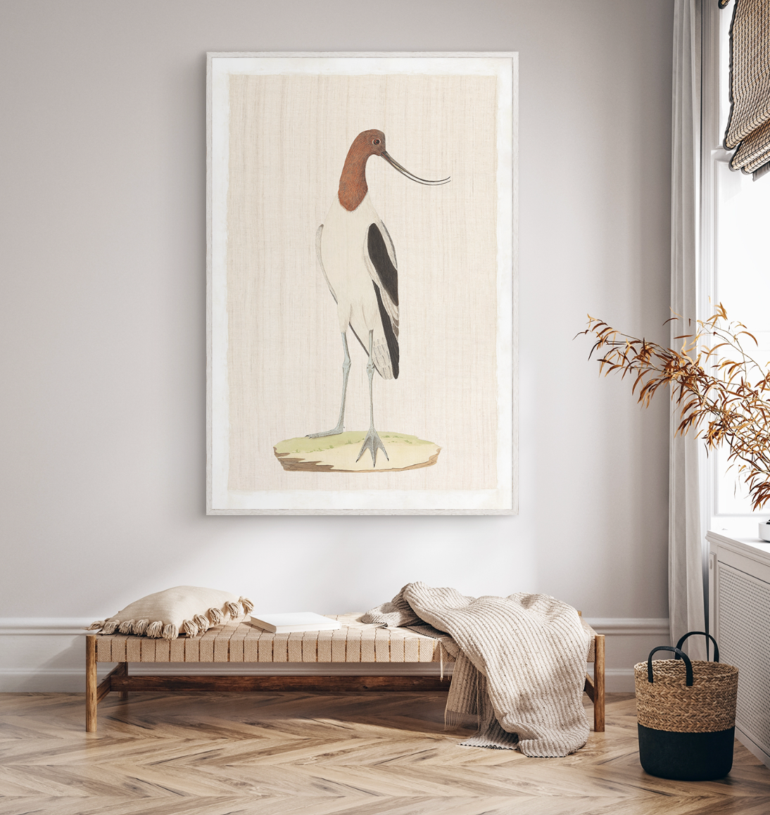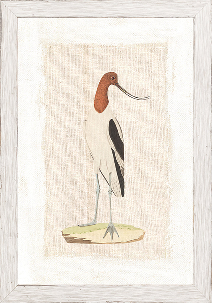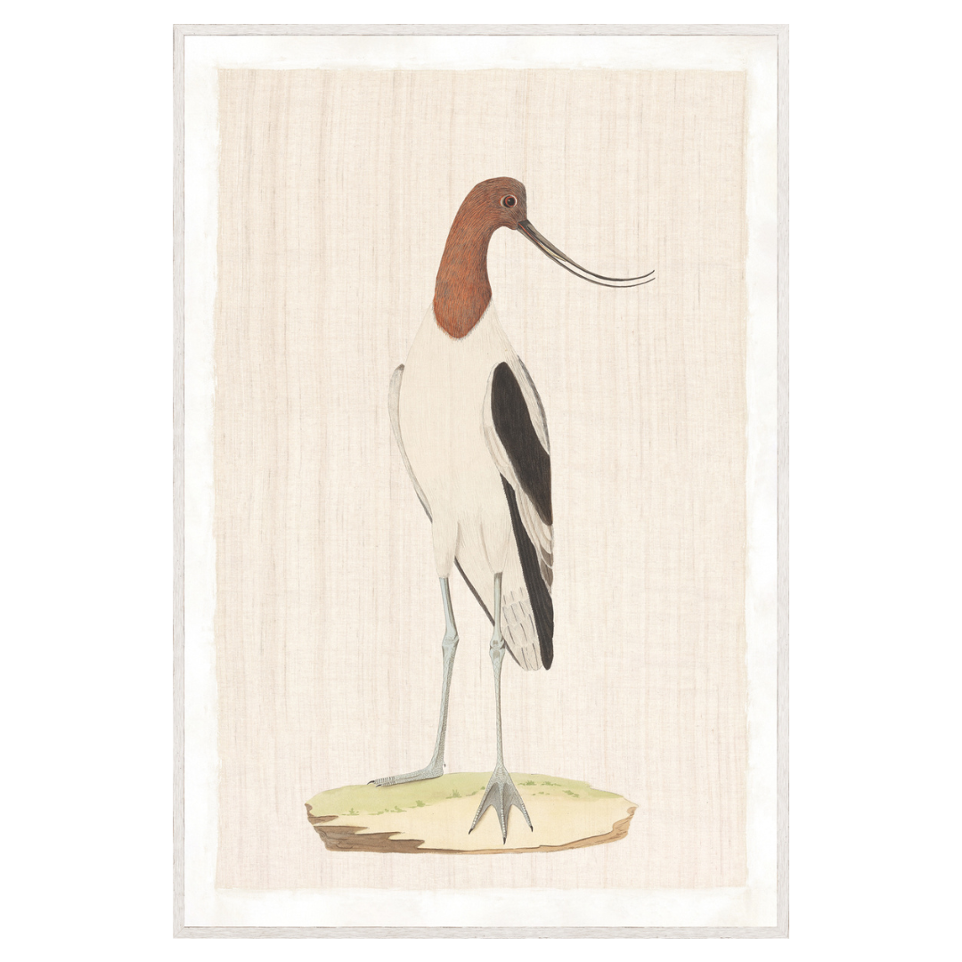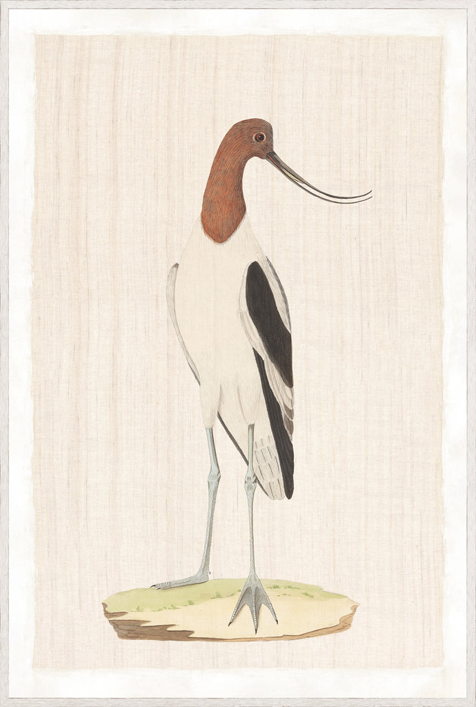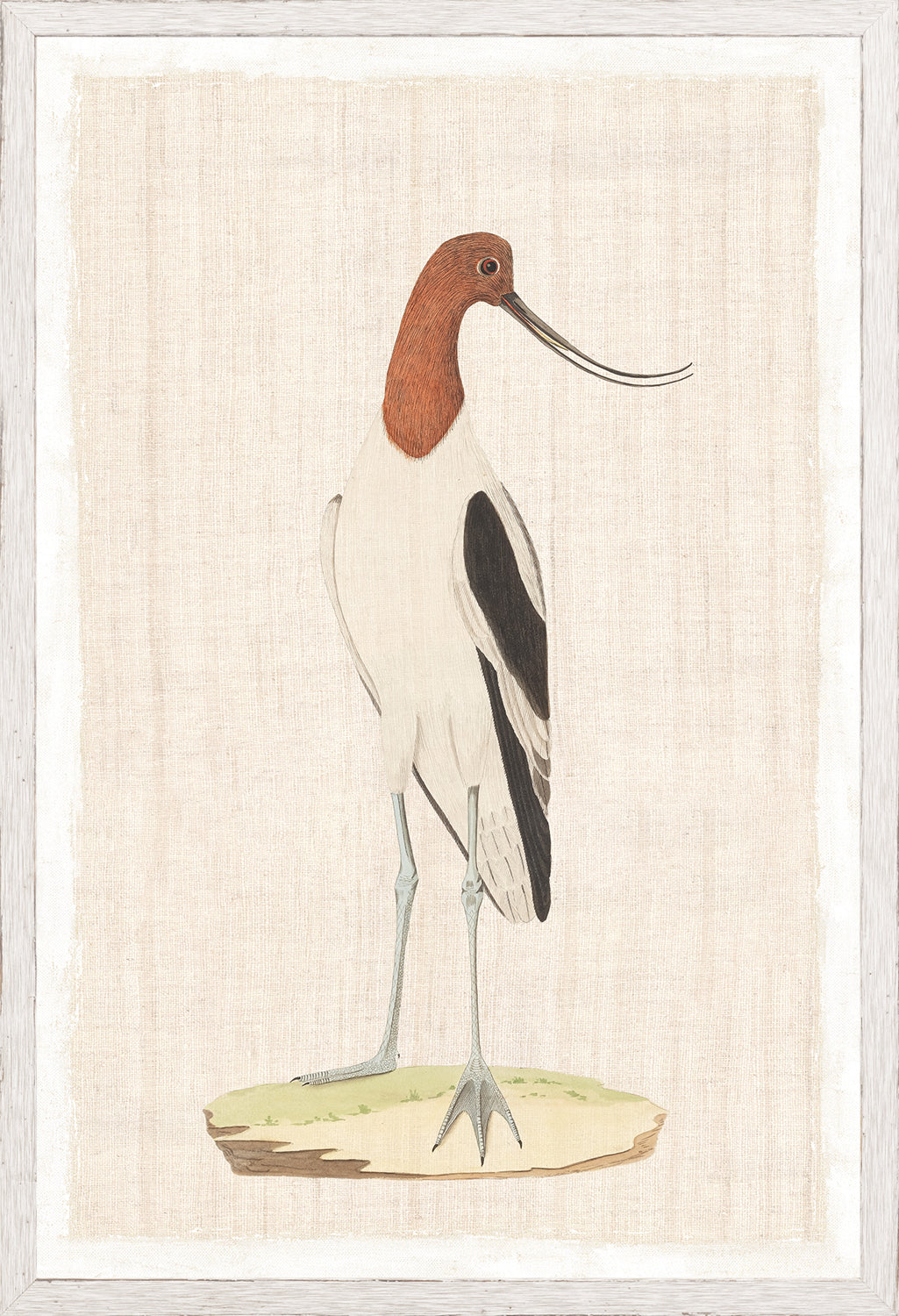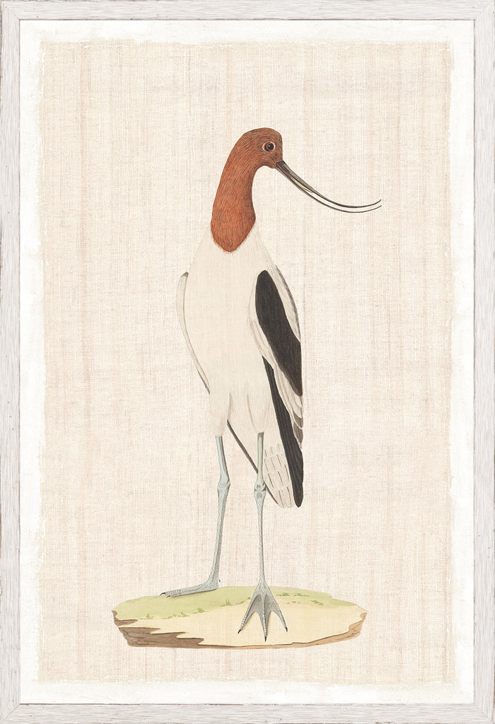A large collection of beautifully detailed aquatic birds from the 1790s placed on a grass paper background and framed with our popular distressed white washed wooden moulding.