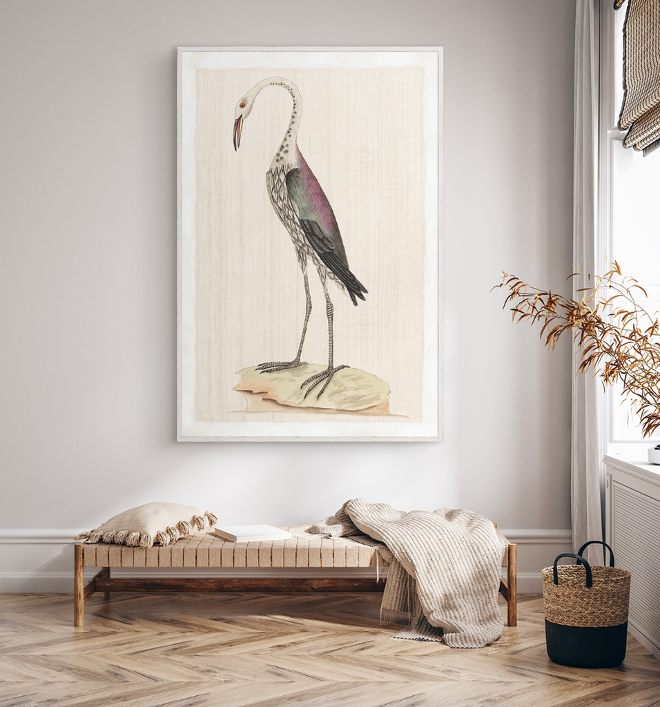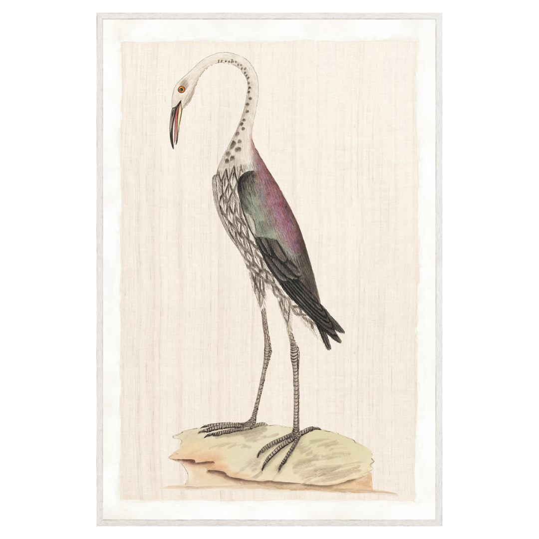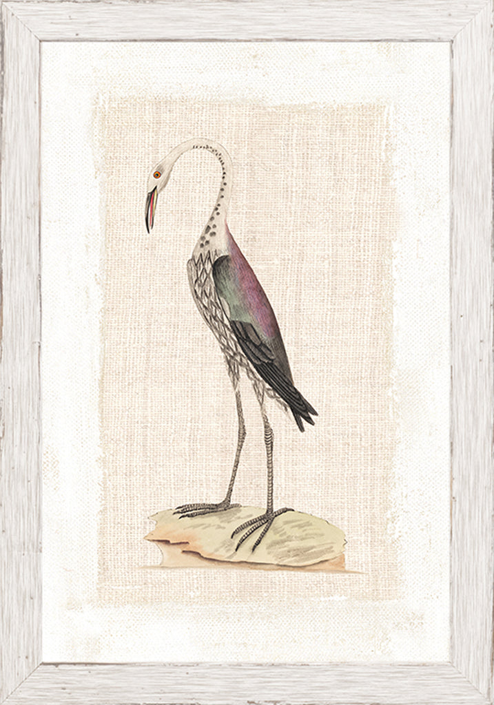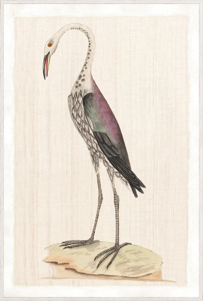 A large collection of beautifully detailed aquatic birds from the 1790s placed on a grass paper background and framed with our popular distressed white washed wooden moulding.