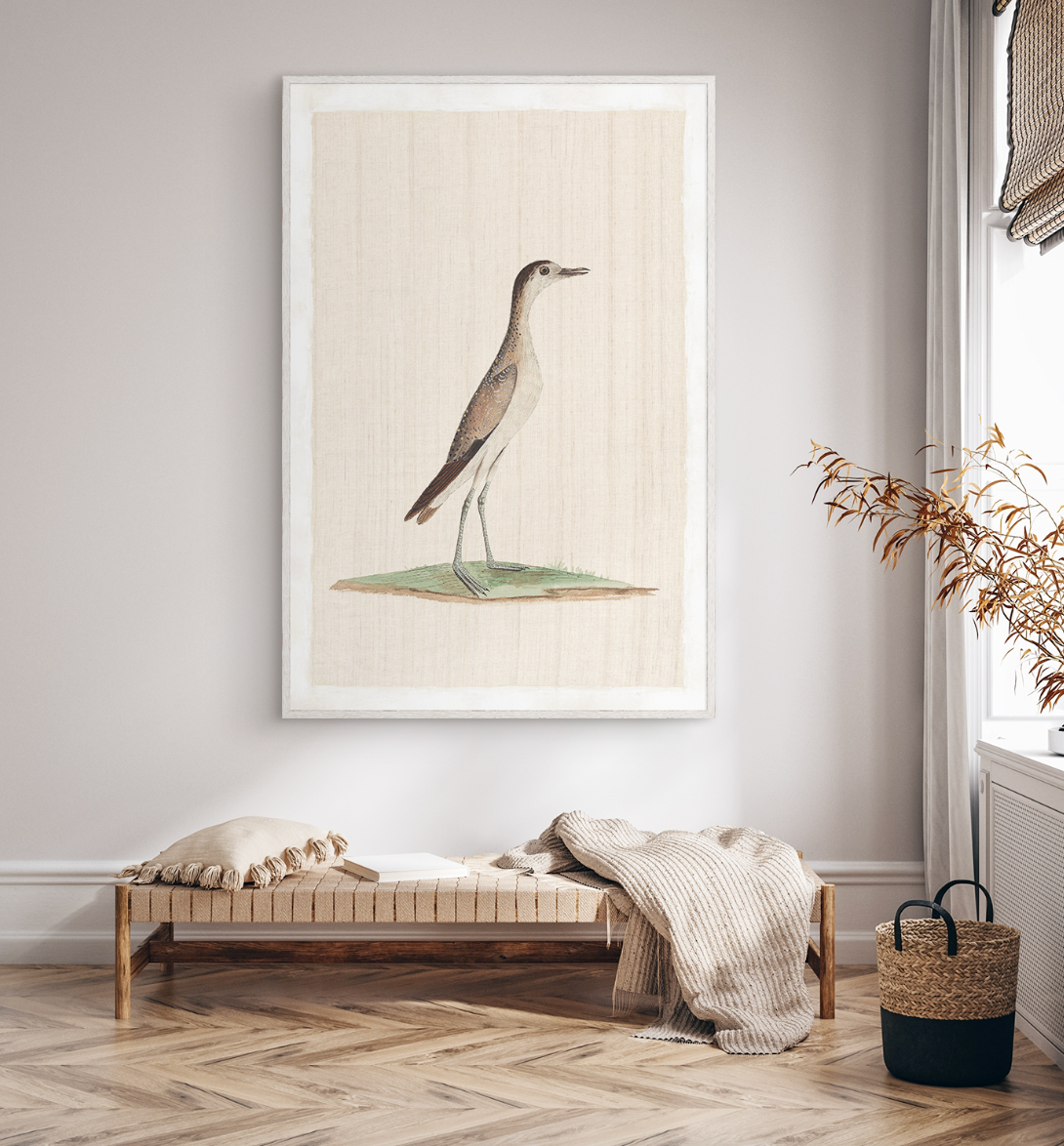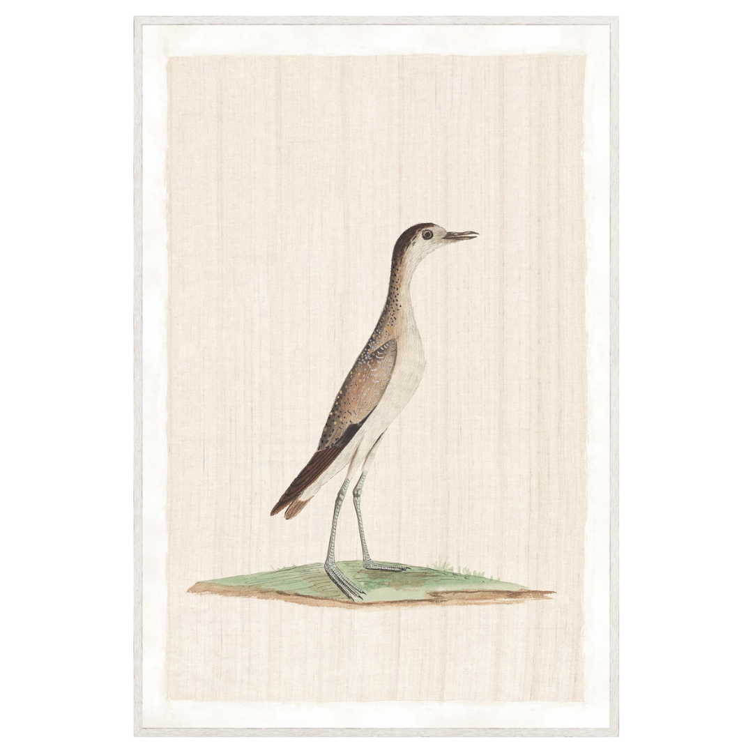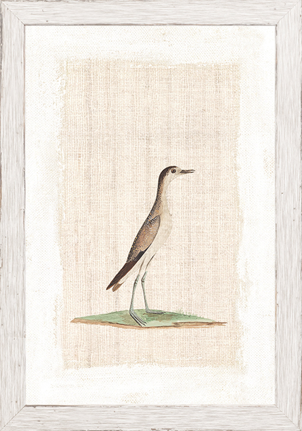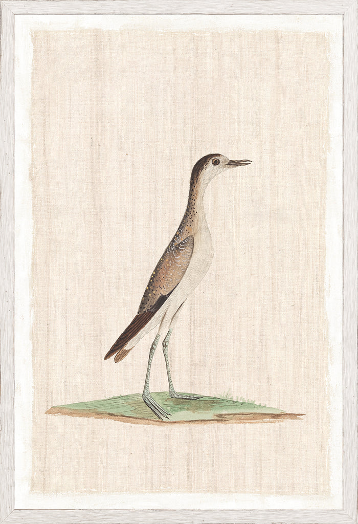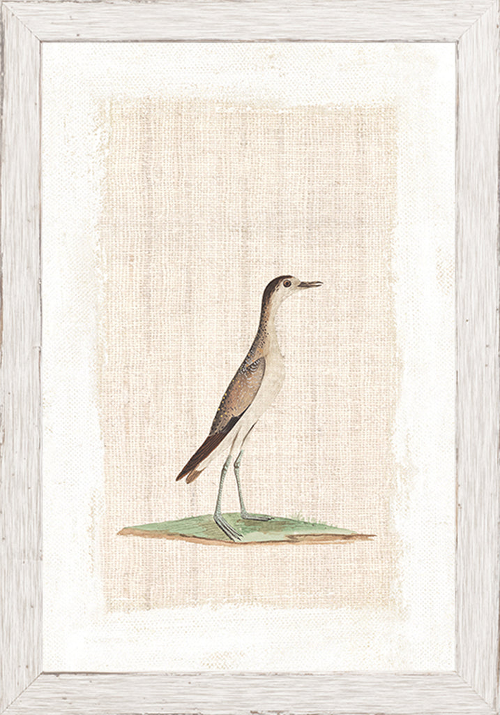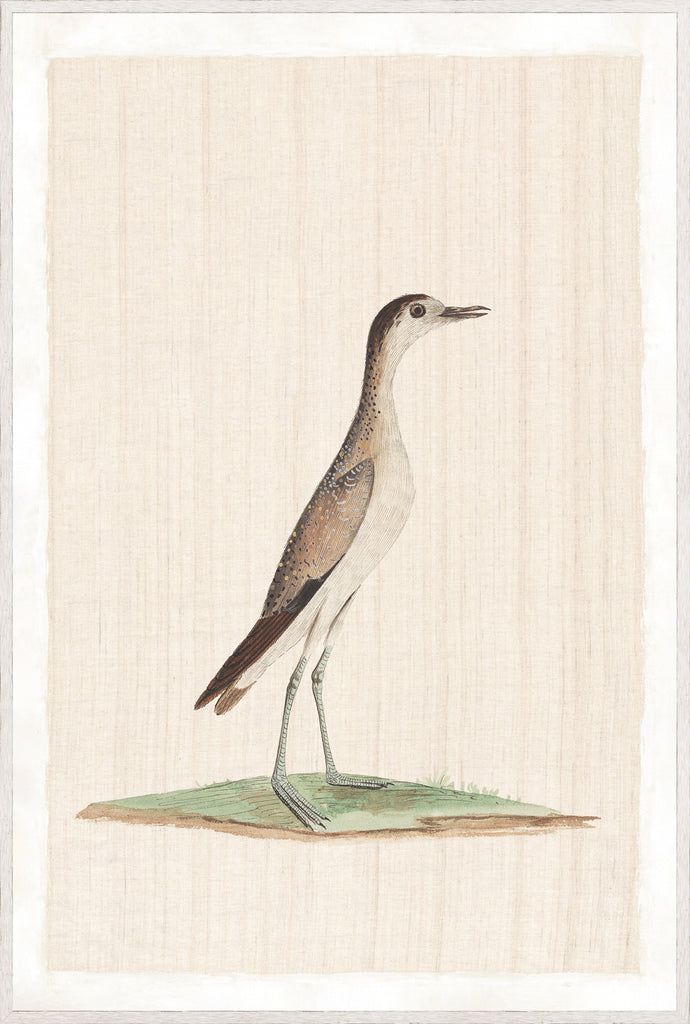 A large collection of beautifully detailed aquatic birds from the 1790s placed on a grass paper background and framed with our popular distressed white washed wooden moulding.