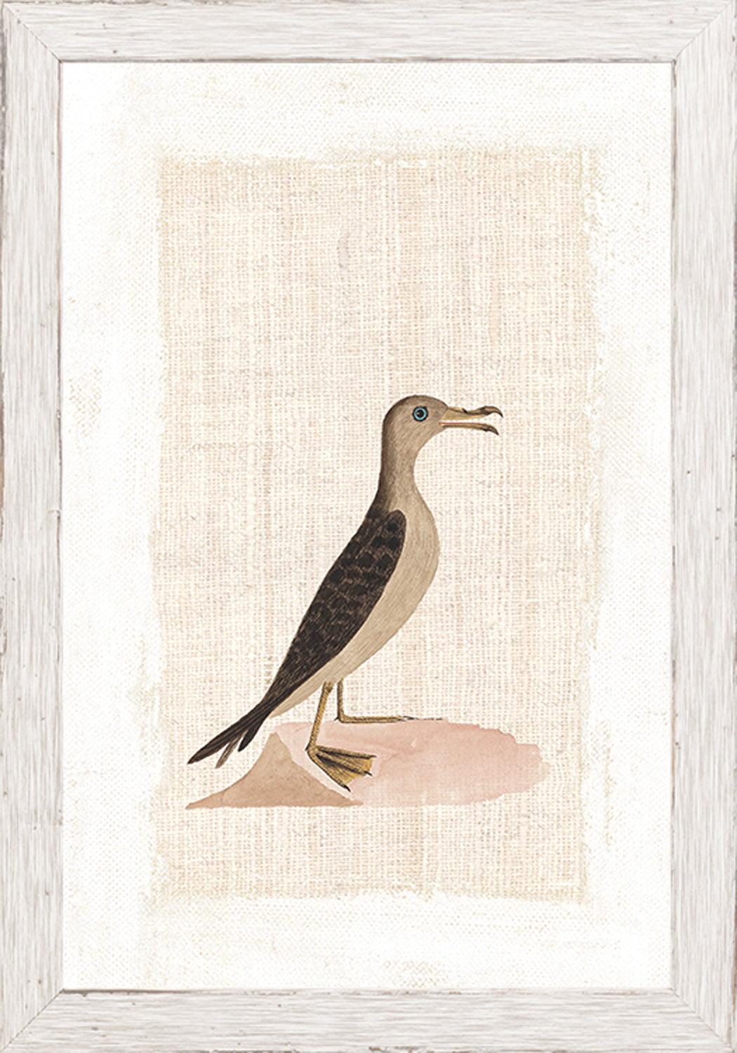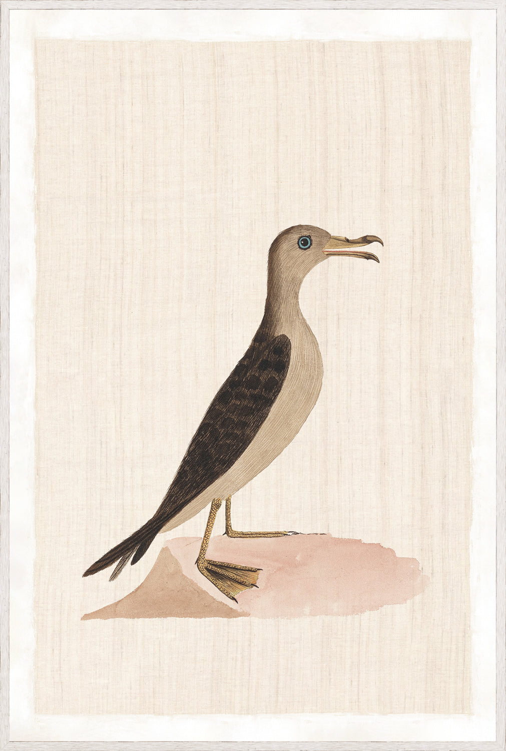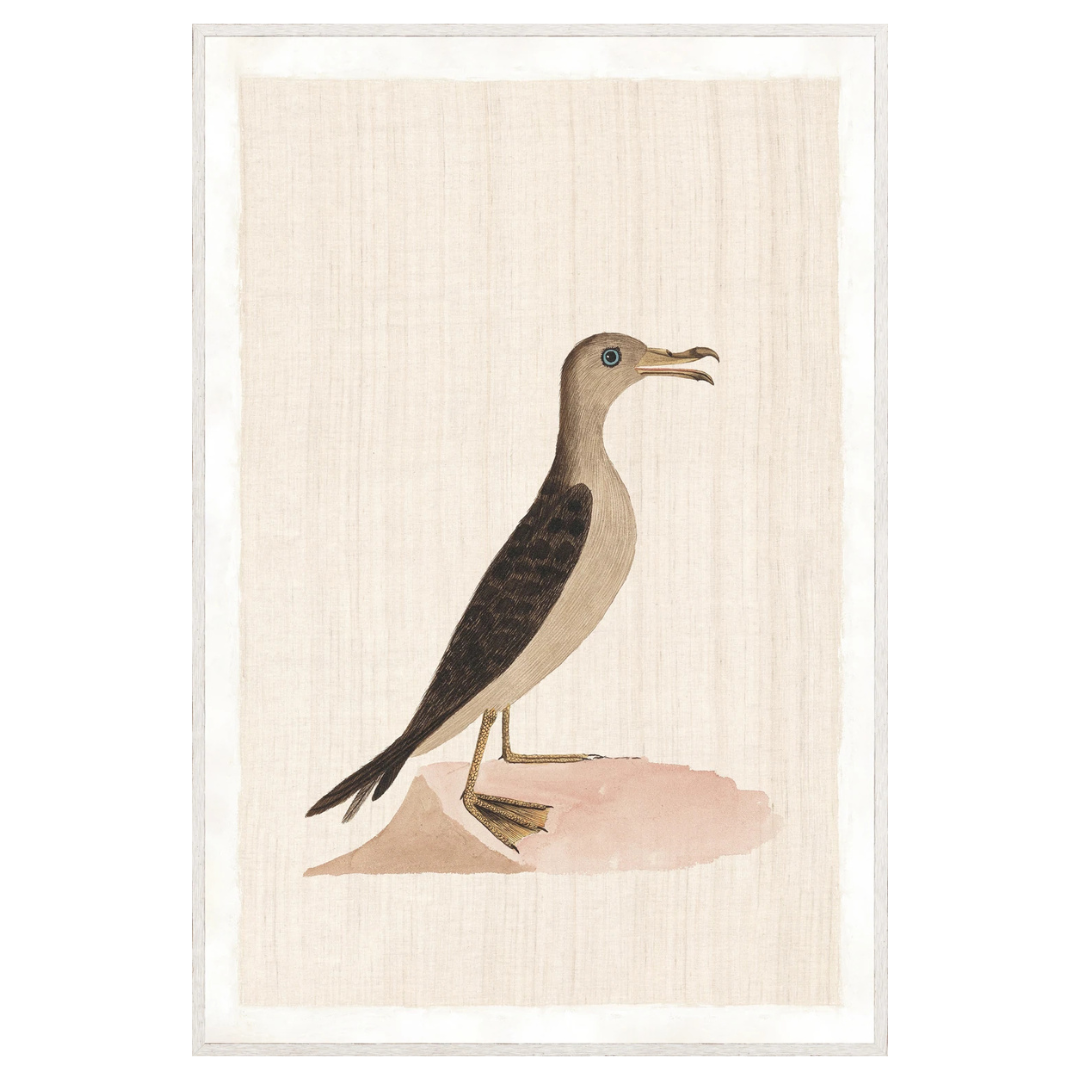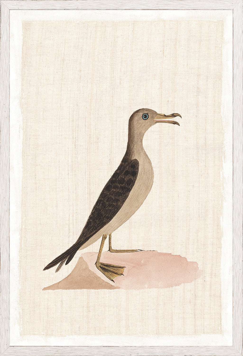 A large collection of beautifully detailed aquatic birds from the 1790s placed on a grass paper background and framed with our popular distressed white washed wooden moulding.