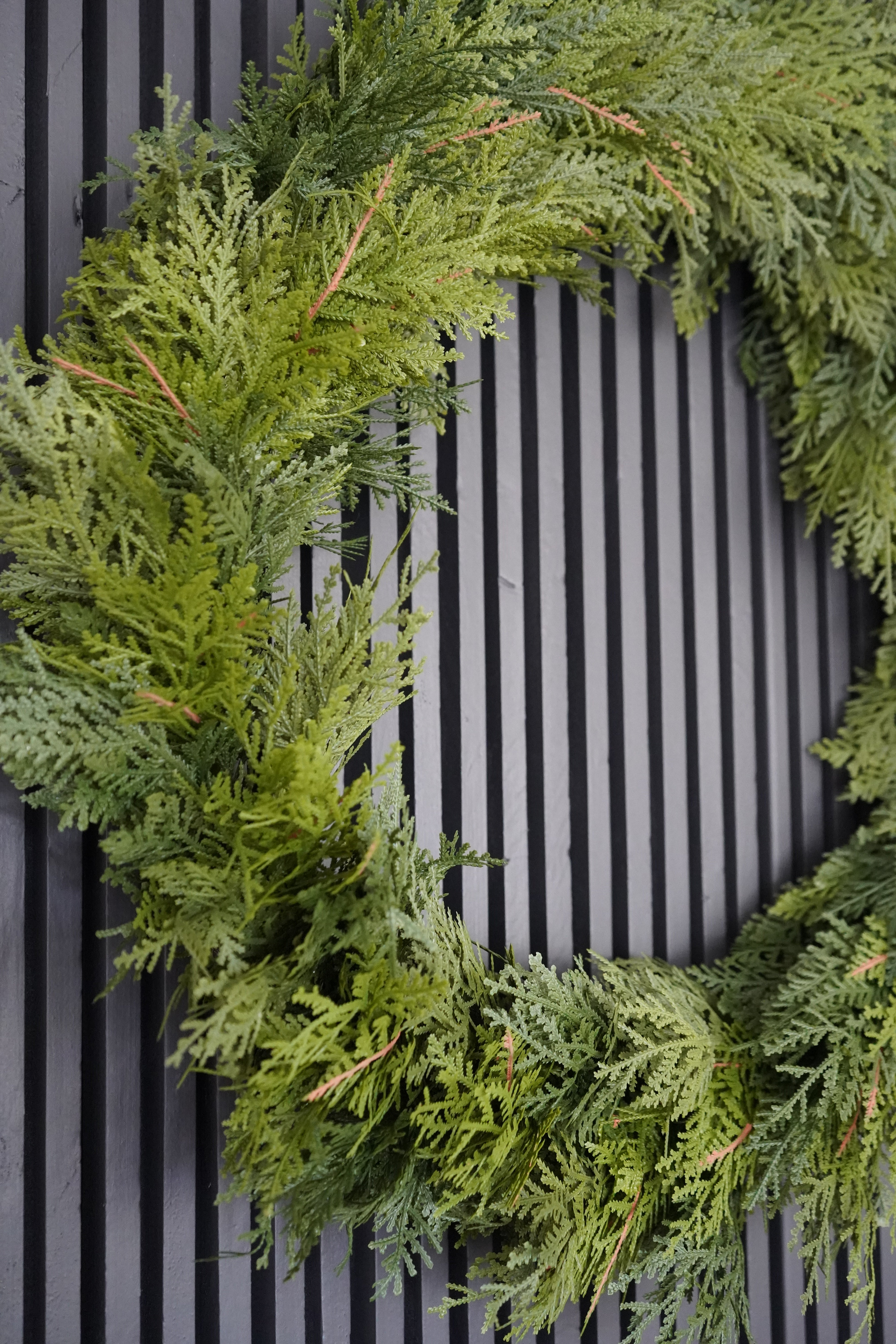 Celebrate the season with our Oversized Fresh Touch Northern White Cedar Wreath, featuring lush, natural-looking cedar greenery for a fresh and timeless look. Perfect for doors, mantels, or windows, this versatile wreath adds classic charm to your decor. Display it simply on it's own, or pair with our velvet ribbon to bring warmth and elegance into your home this festive season.