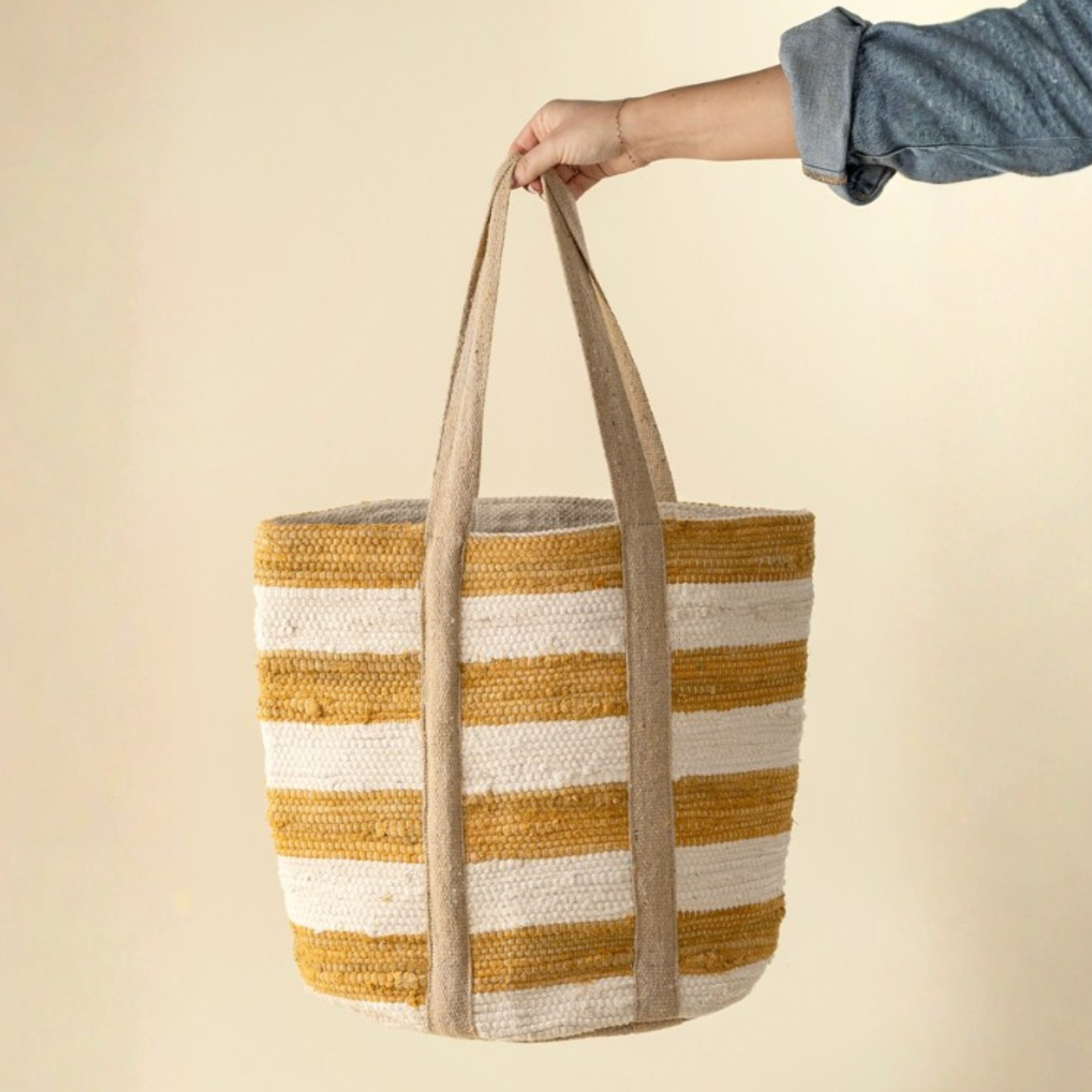 Bright and bold, the Beach Stripe Basket Tote in Sunflower brings sunshine to your everyday carry. Handwoven from recycled cotton chindi and durable jute, this market bag features a classic stripe design in warm yellow and ivory tones. The sturdy, over-the-shoulder straps are made from recycled cotton with subtle rainbow flecks, adding a playful, eco-friendly twist. Spacious and versatile, it’s ideal for market hauls, weekend errands, or as a charming accent decor piece to hold throws or magazines at the end of the sofa