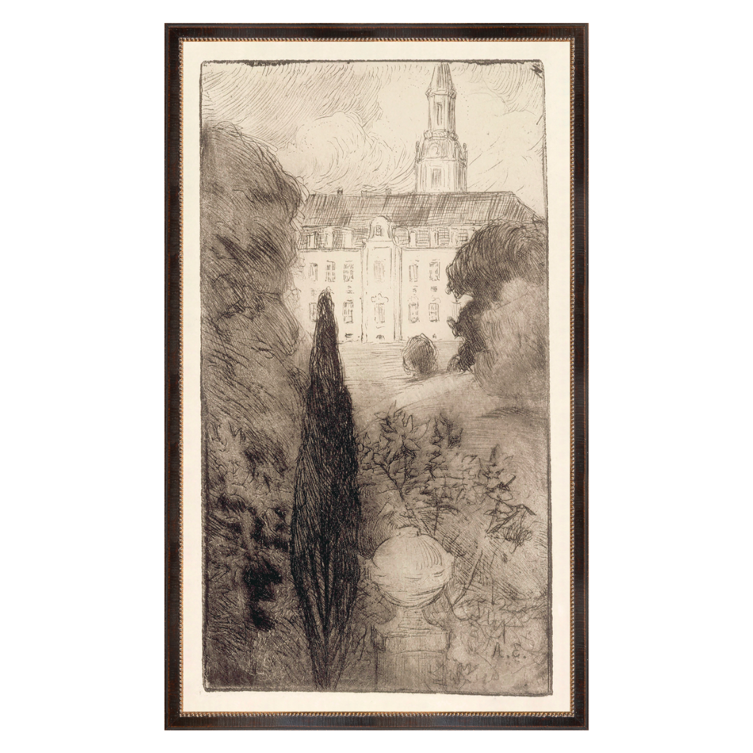 From the vantage point of a shady garden, a clear and airy image of a manor with a tall steeple in the distance.