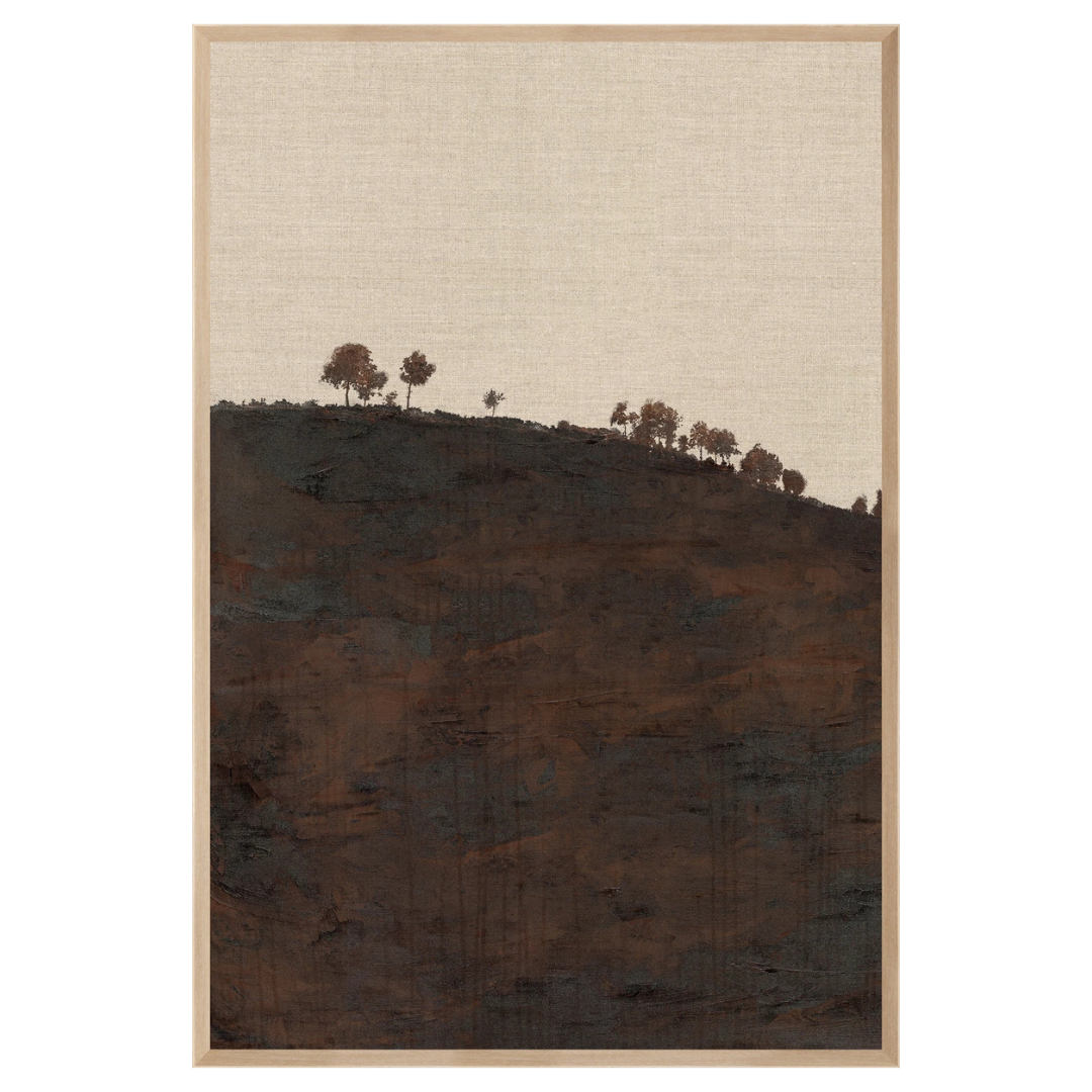 Vistas of silhouetted distant hills richly painted with a textural foreground and blended with a natural linen. These pieces utilize a strong sense of negative space to create compelling compositions.
