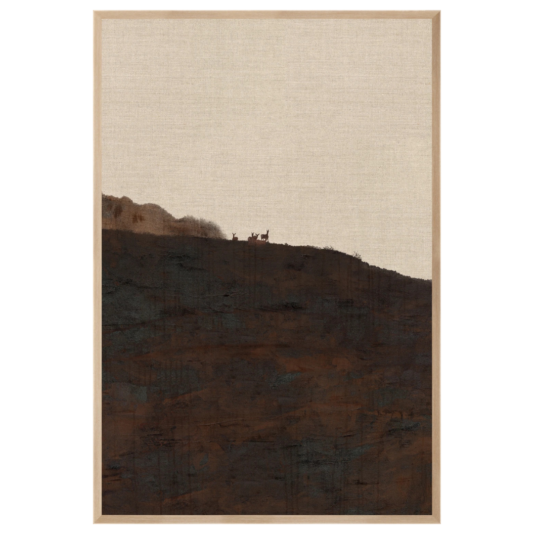 Vistas of silhouetted distant hills richly painted with a textural foreground and blended with a natural linen. These pieces utilize a strong sense of negative space to create compelling compositions.