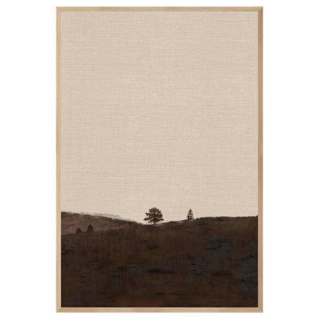 Vistas of silhouetted distant hills richly painted with a textural foreground and blended with a natural linen. These pieces utilize a strong sense of negative space to create compelling compositions.