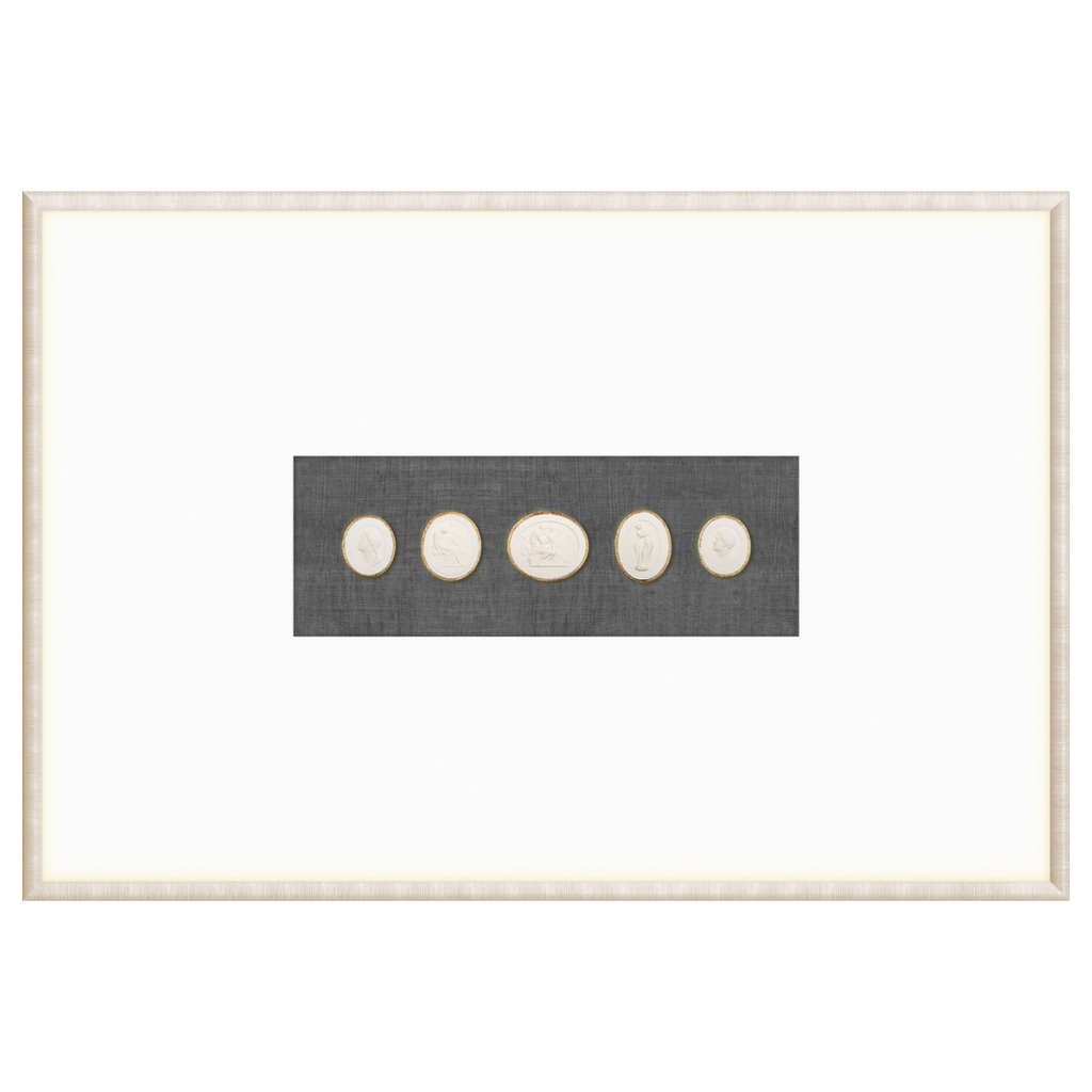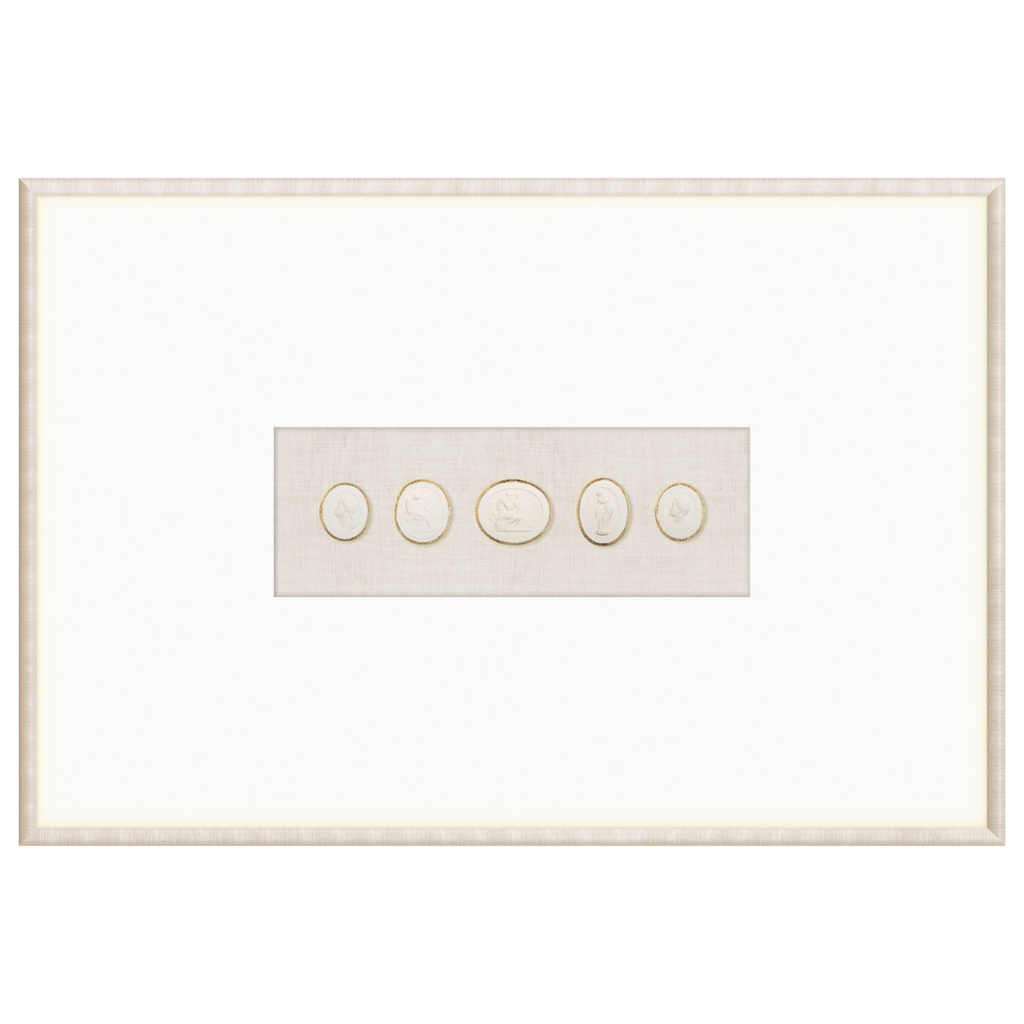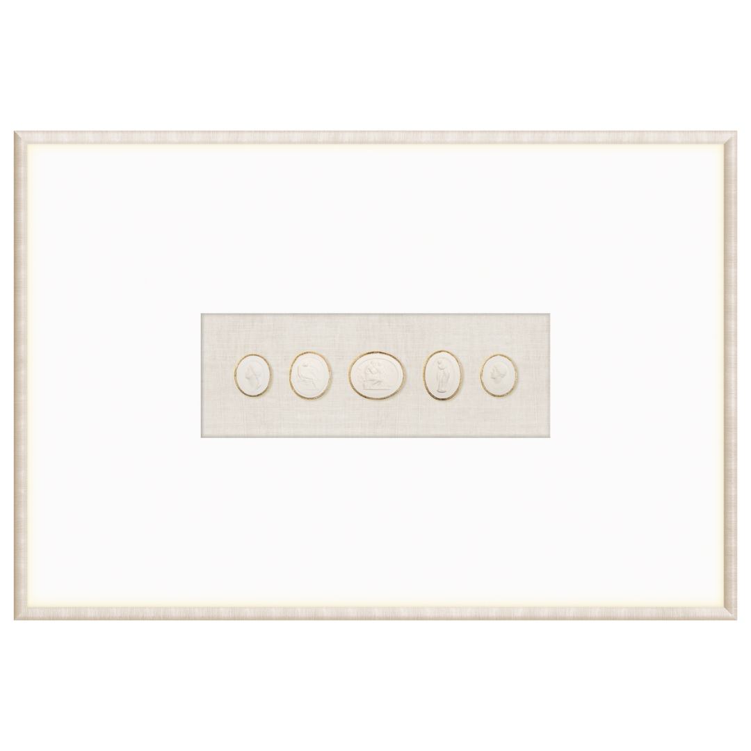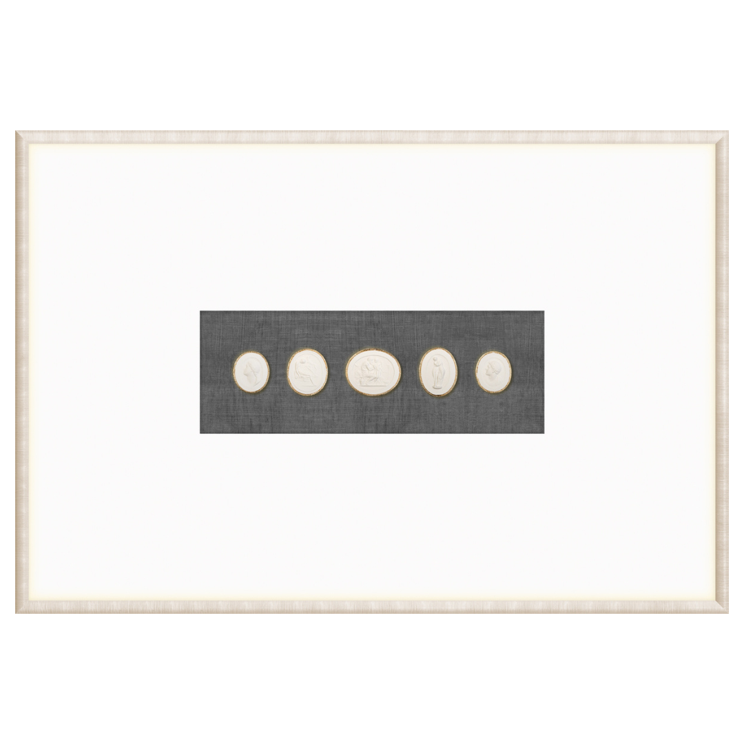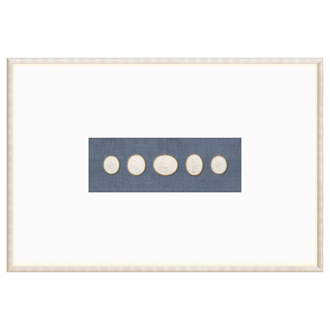 Our collection of Intaglios features both mythological and historical figures. Each one is hand-cast and gilded with fine gold filigree along the upper edge, framing the carved images and making them truly unique pieces. Each grouping is mounted on a linen texture background in a variety of colour options. They are framed in a light, neutral-toned moulding with a striated texture and a wide, raised matte with gilded framespace, giving them even more elegance and luxury. With our wide variety of arrangements and different combinations of Intaglios, you’re sure to find the perfect groupings for you.