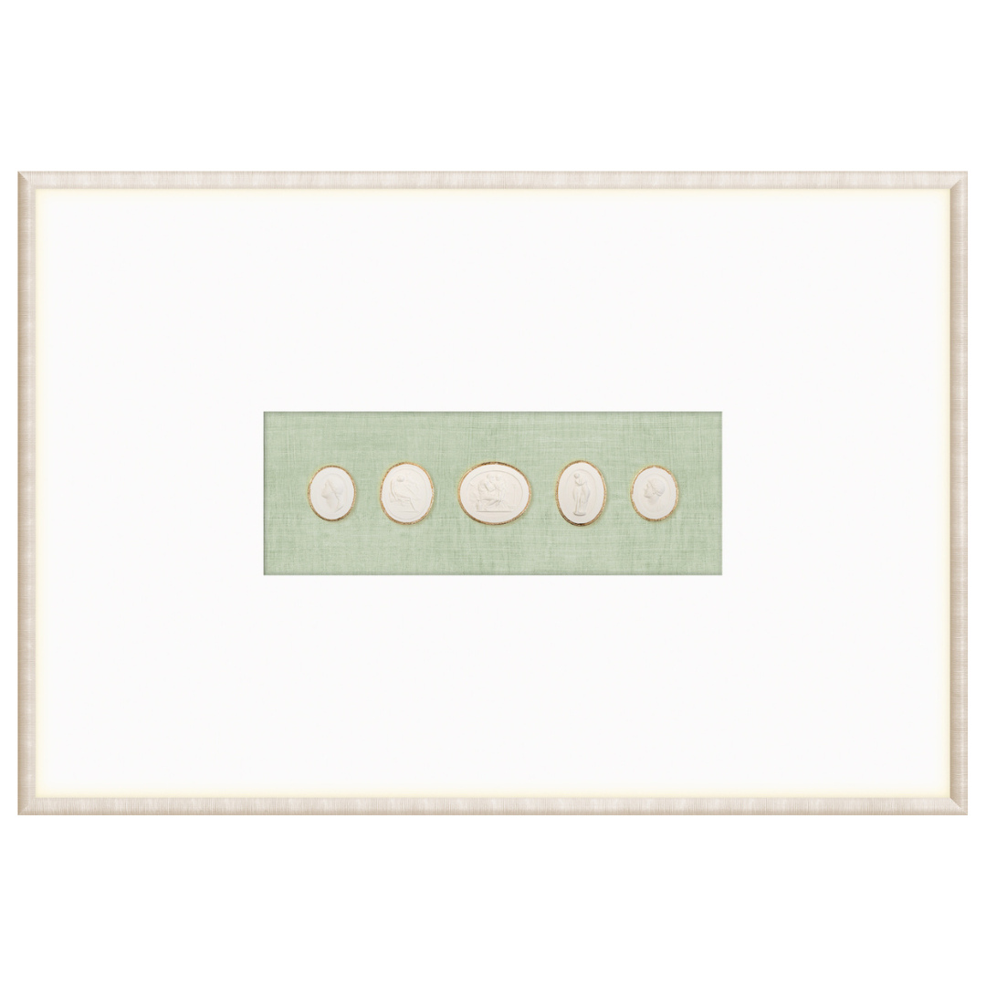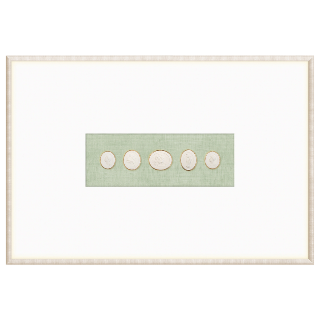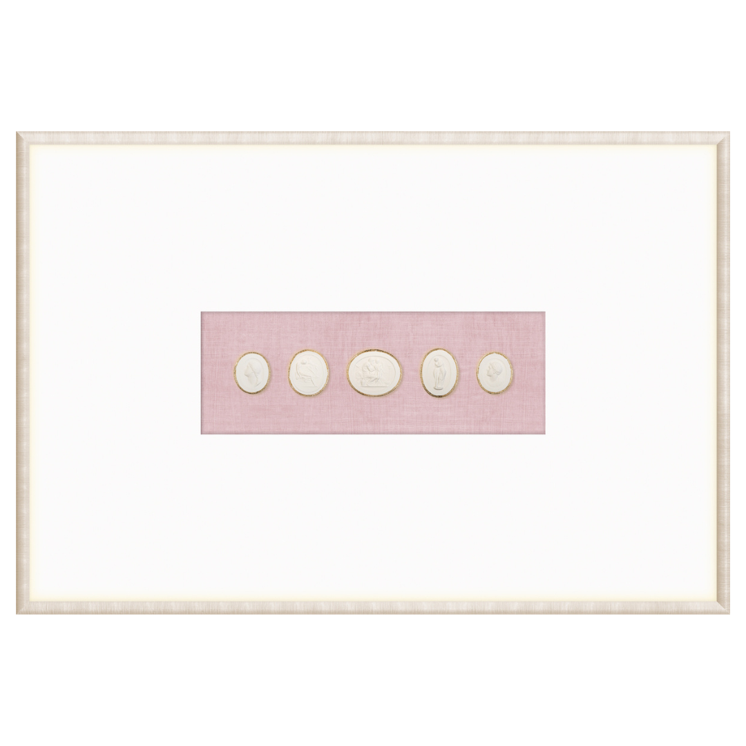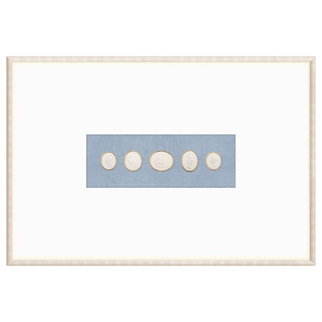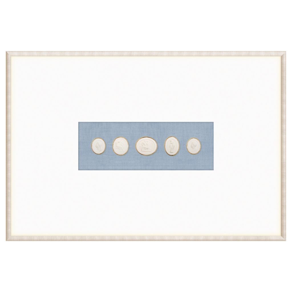 Our collection of Intaglios features both mythological and historical figures. Each one is hand-cast and gilded with fine gold filigree along the upper edge, framing the carved images and making them truly unique pieces. Each grouping is mounted on a linen texture background in a variety of colour options. They are framed in a light, neutral-toned moulding with a striated texture and a wide, raised matte with gilded framespace, giving them even more elegance and luxury. With our wide variety of arrangements and different combinations of Intaglios, you’re sure to find the perfect groupings for you.