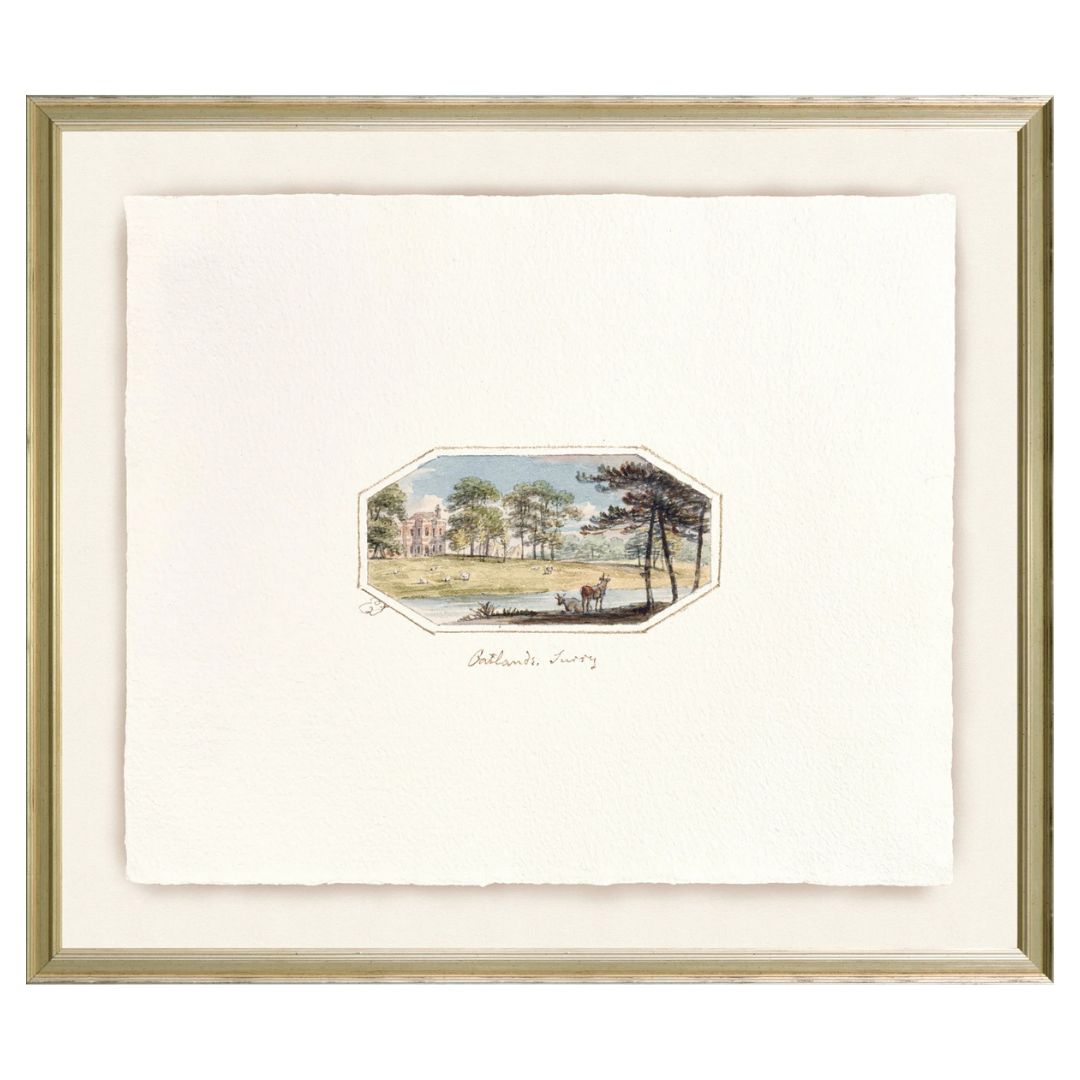 Beautiful miniature watercolours over graphite on cream wove paper, depicting English country seats, abbeys, and castles. Shown in high relief with a drop shadow to give the illusion of a three-dimensional paper.