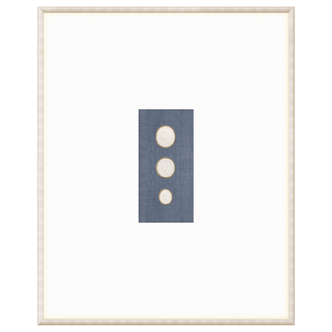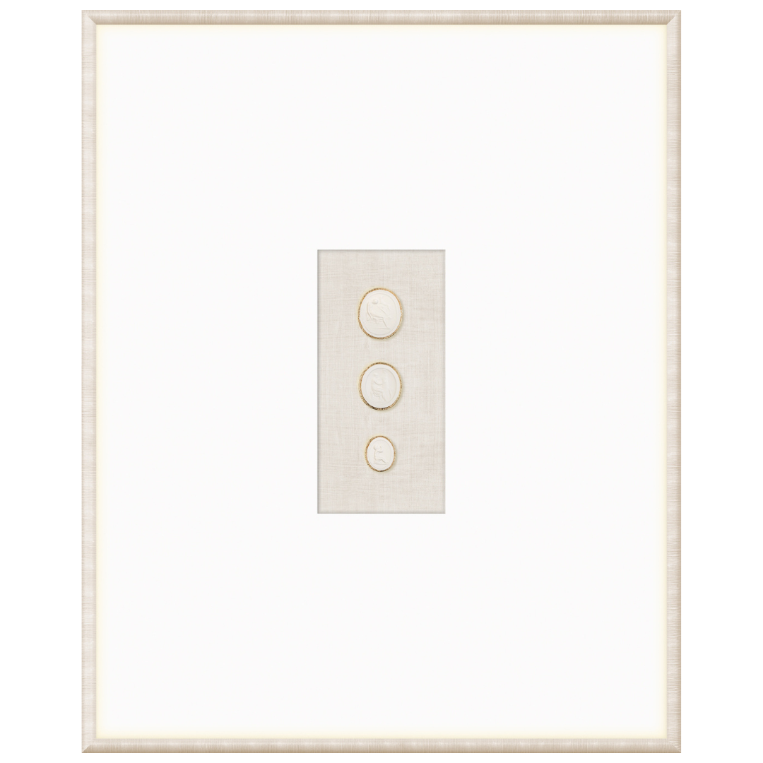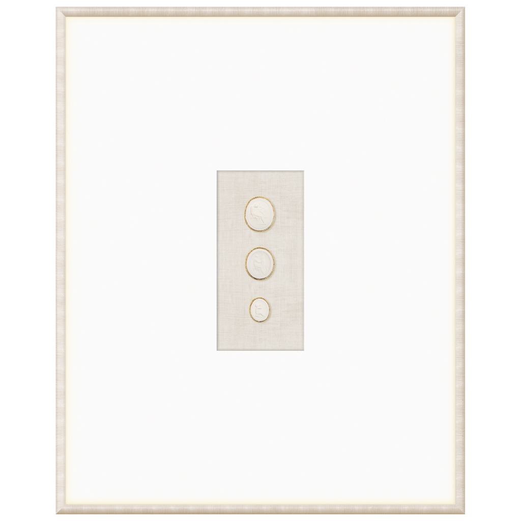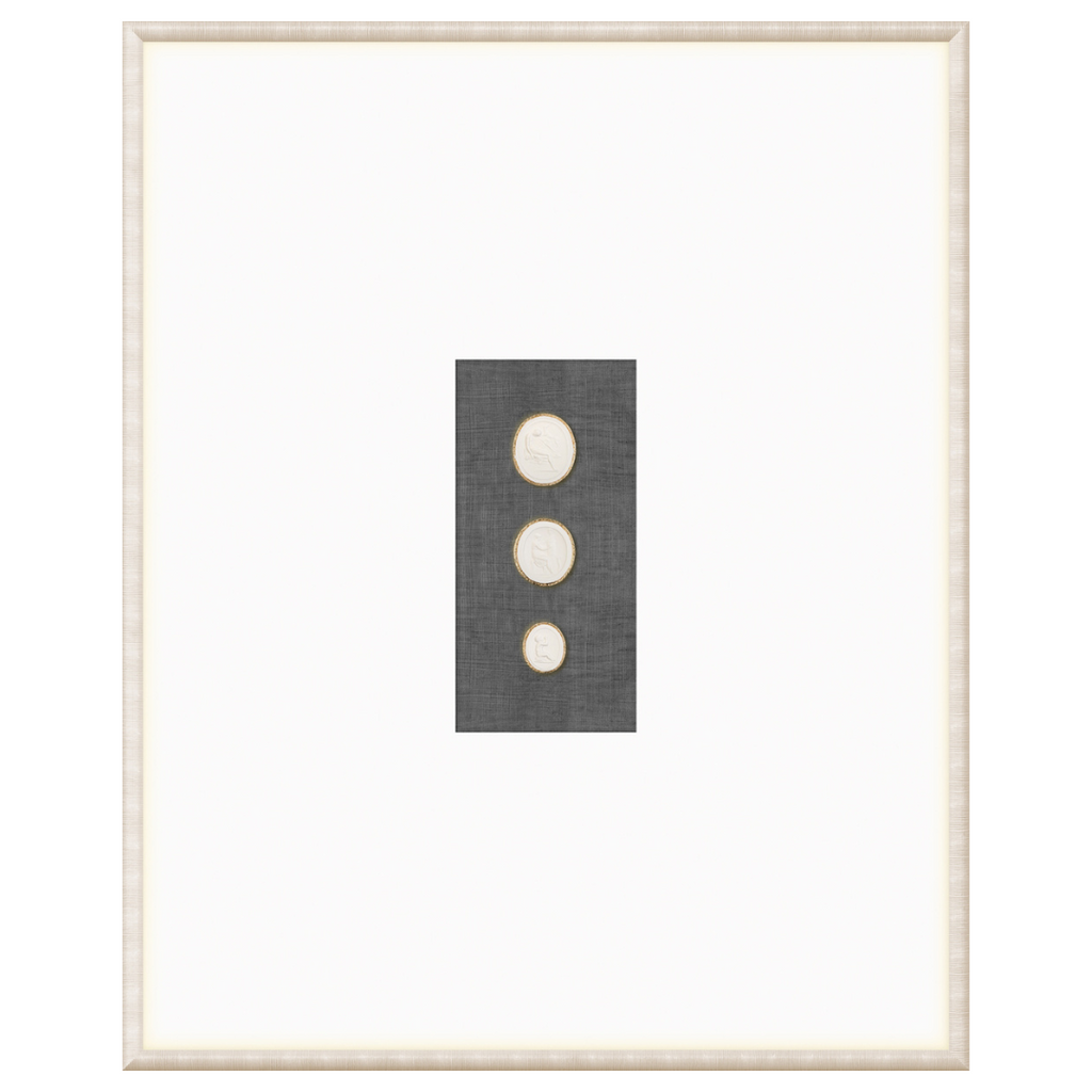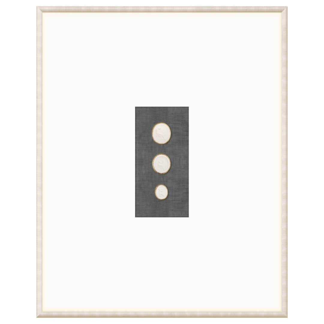 Our collection of Intaglios features both mythological and historical figures. Each one is hand-cast and gilded with fine gold filigree along the upper edge, framing the carved images and making them truly unique pieces. Each grouping is mounted on a linen texture background in a variety of colour options. They are framed in a light, neutral-toned moulding with a striated texture and a wide, raised matte with gilded framespace, giving them even more elegance and luxury. With our wide variety of arrangements and different combinations of Intaglios, you’re sure to find the perfect groupings for you.