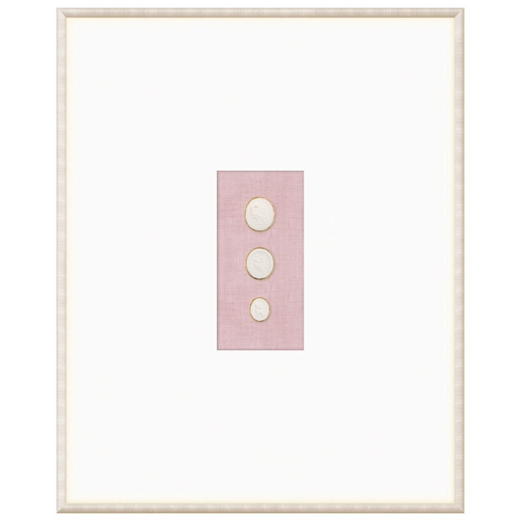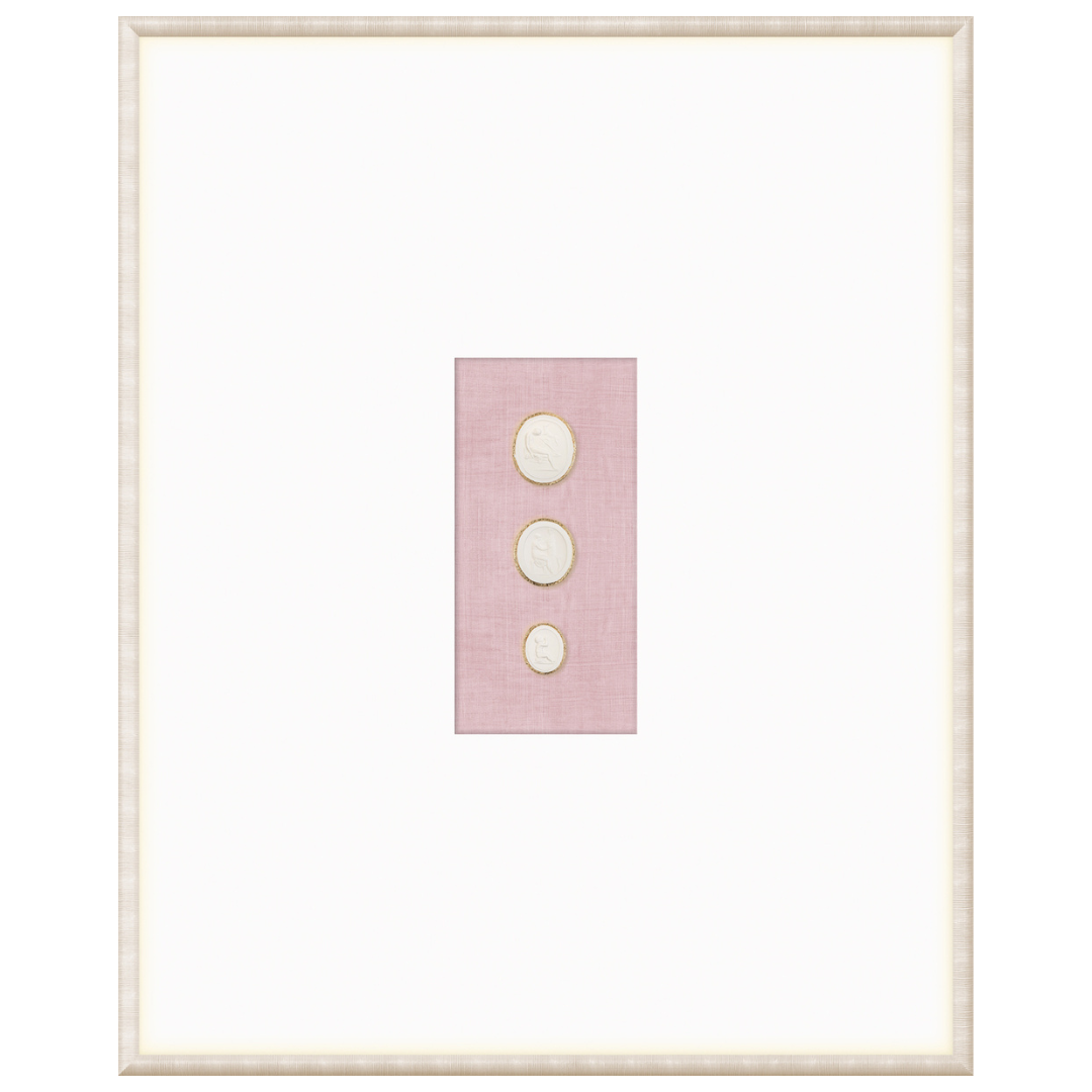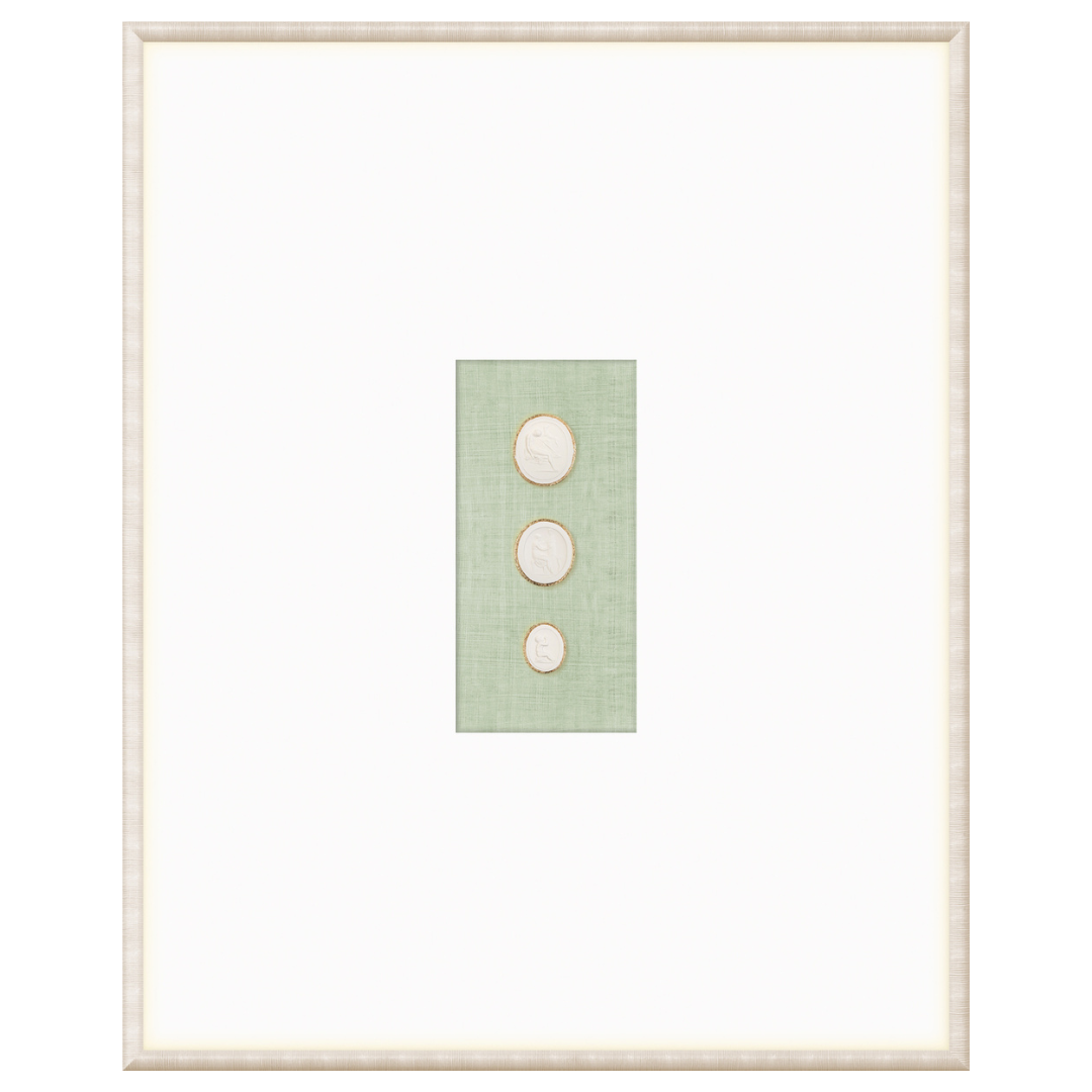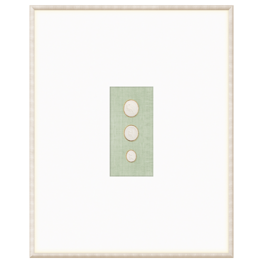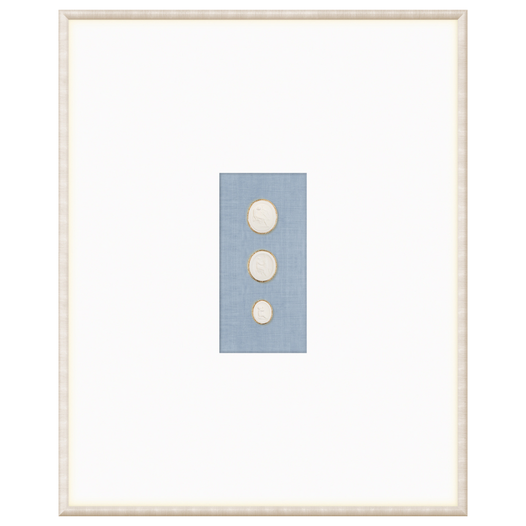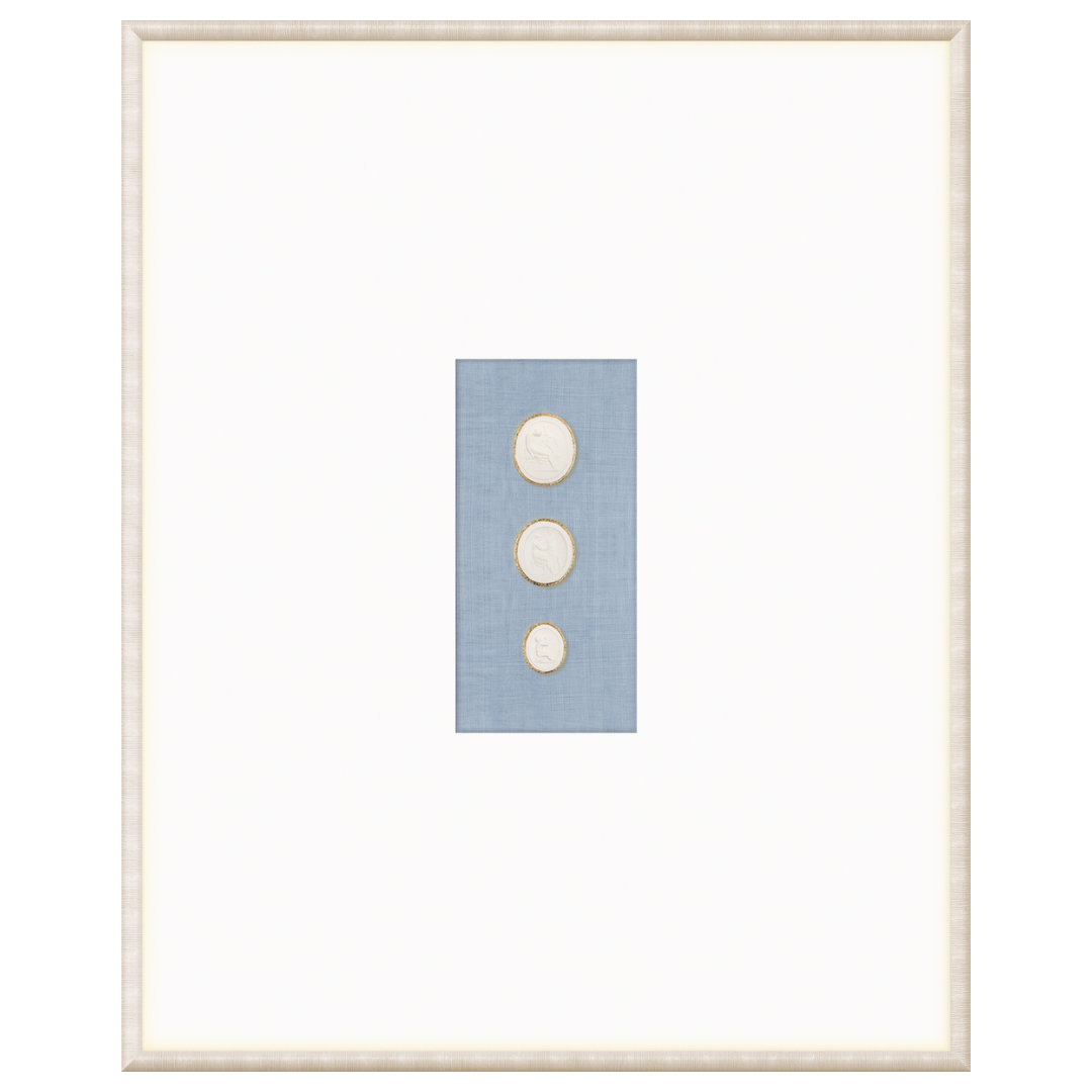 Our collection of Intaglios features both mythological and historical figures. Each one is hand-cast and gilded with fine gold filigree along the upper edge, framing the carved images and making them truly unique pieces. Each grouping is mounted on a linen texture background in a variety of colour options. They are framed in a light, neutral-toned moulding with a striated texture and a wide, raised matte with gilded framespace, giving them even more elegance and luxury. With our wide variety of arrangements and different combinations of Intaglios, you’re sure to find the perfect groupings for you.