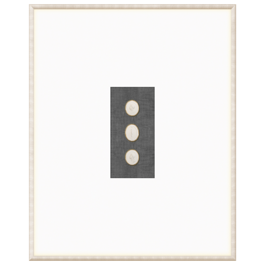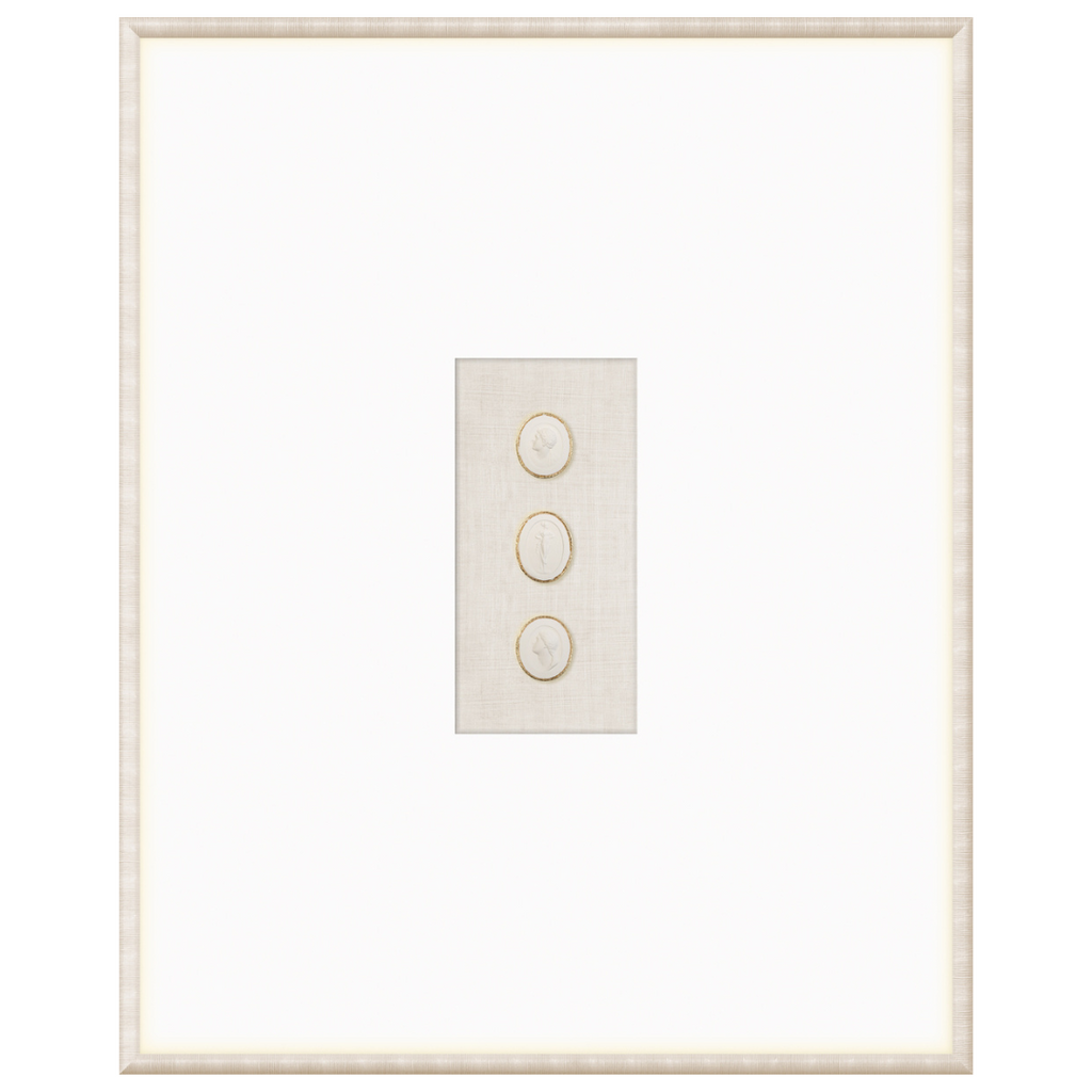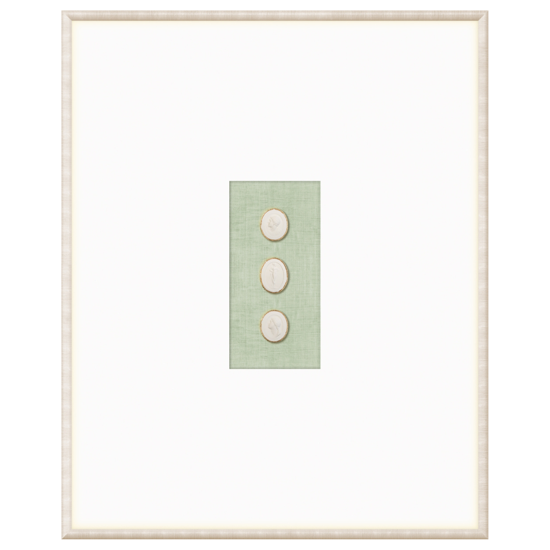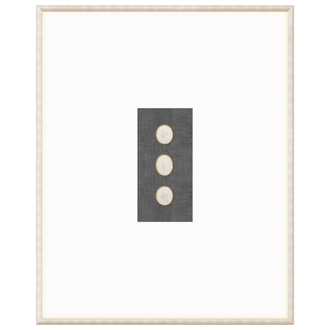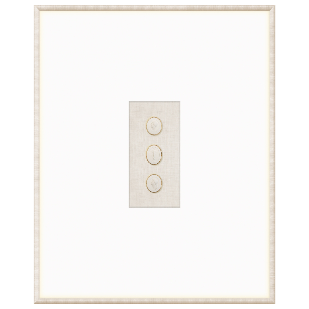 Our collection of Intaglios features both mythological and historical figures. Each one is hand-cast and gilded with fine gold filigree along the upper edge, framing the carved images and making them truly unique pieces. Each grouping is mounted on a linen texture background in a variety of colour options. They are framed in a light, neutral-toned moulding with a striated texture and a wide, raised matte with gilded framespace, giving them even more elegance and luxury. With our wide variety of arrangements and different combinations of Intaglios, you’re sure to find the perfect groupings for you.