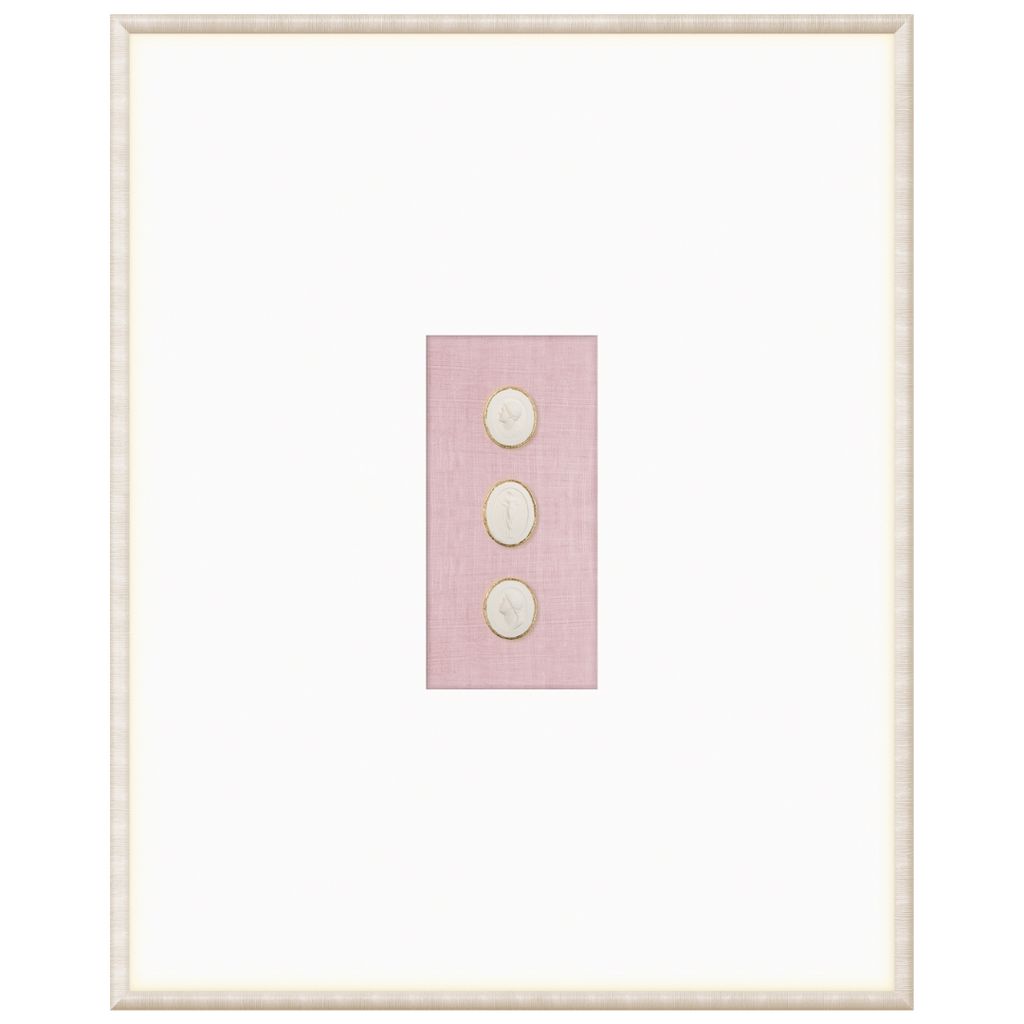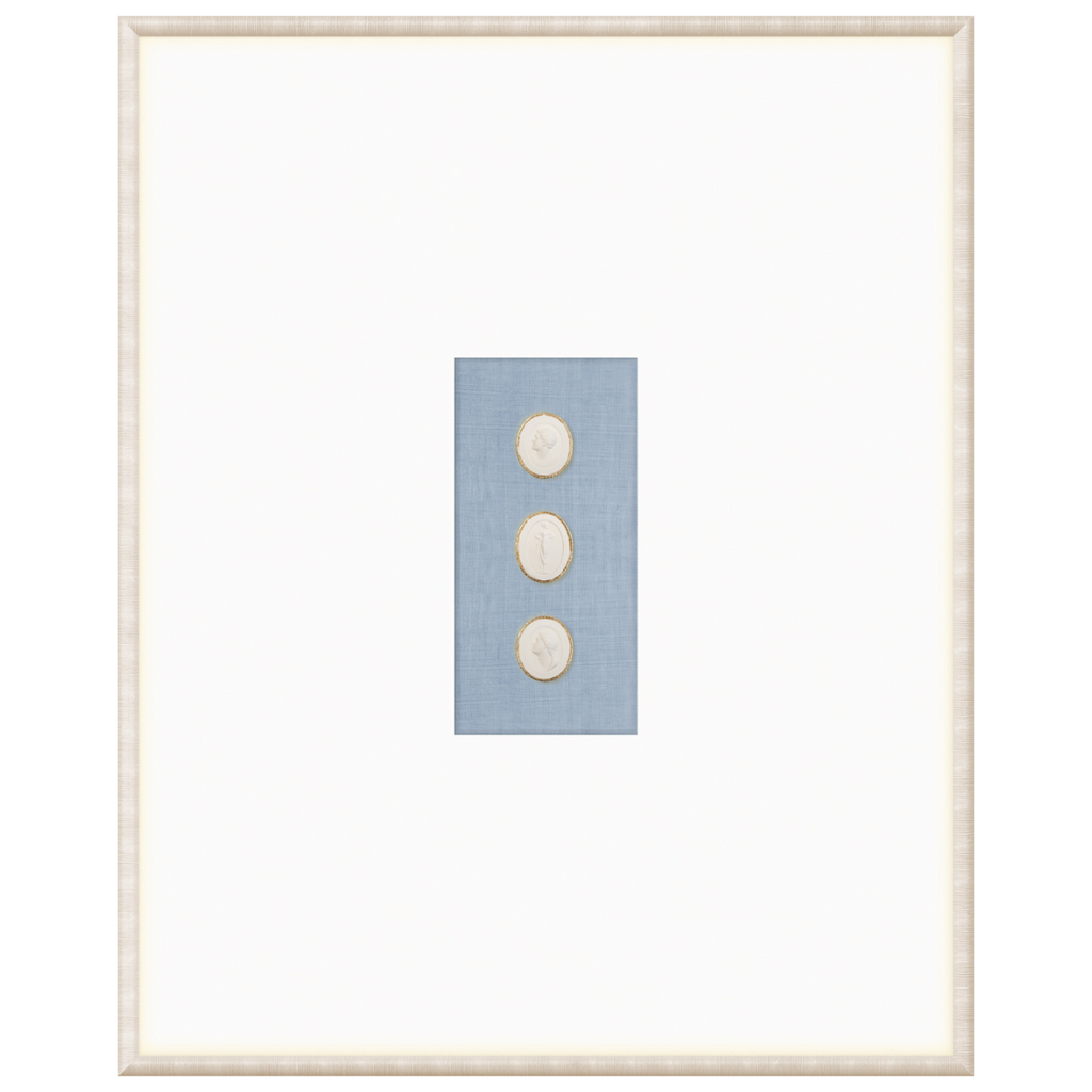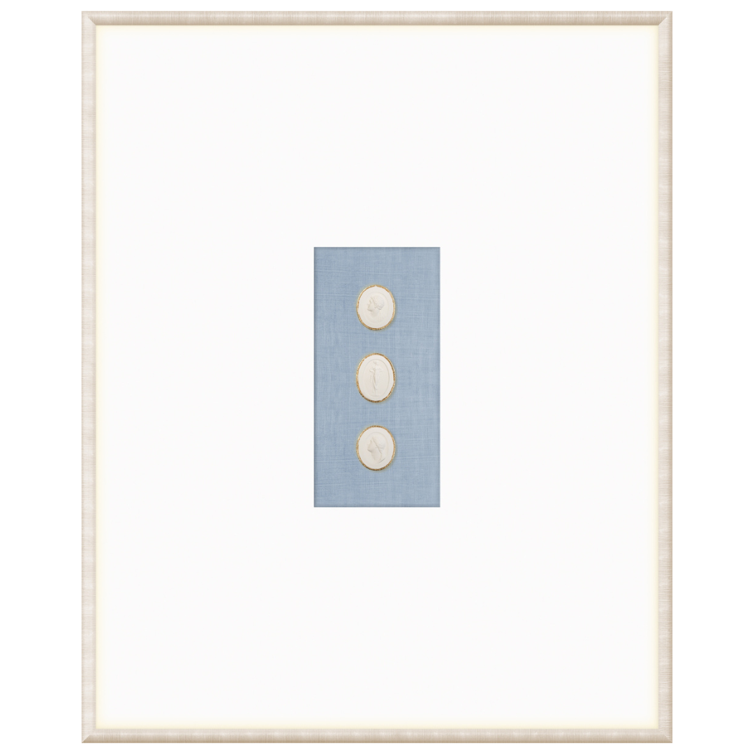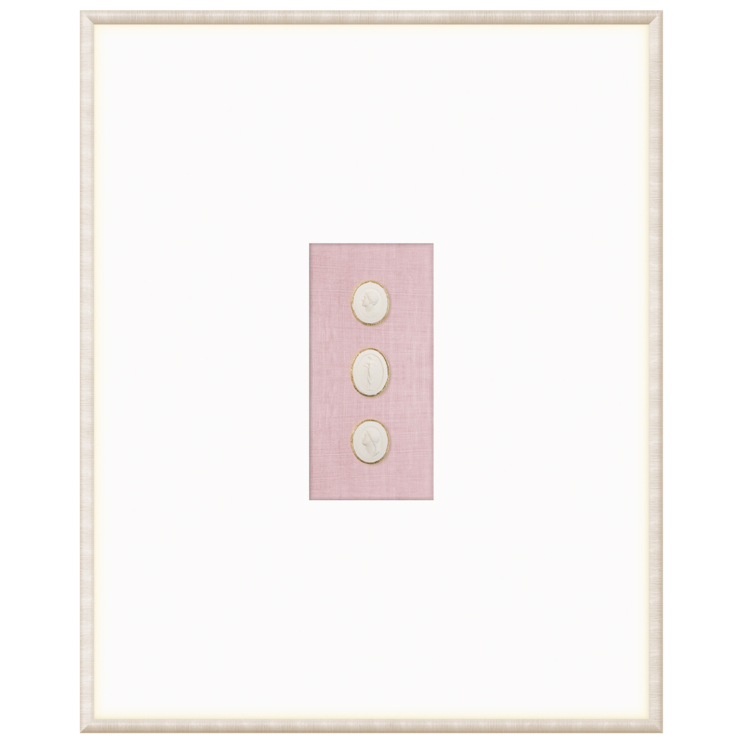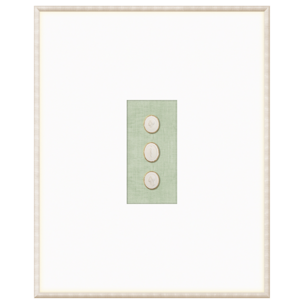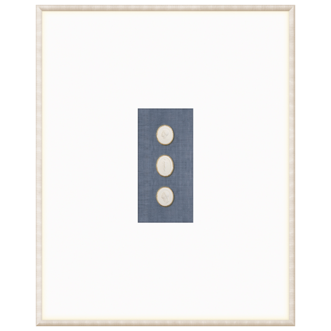Our collection of Intaglios features both mythological and historical figures. Each one is hand-cast and gilded with fine gold filigree along the upper edge, framing the carved images and making them truly unique pieces. Each grouping is mounted on a linen texture background in a variety of colour options. They are framed in a light, neutral-toned moulding with a striated texture and a wide, raised matte with gilded framespace, giving them even more elegance and luxury. With our wide variety of arrangements and different combinations of Intaglios, you’re sure to find the perfect groupings for you.