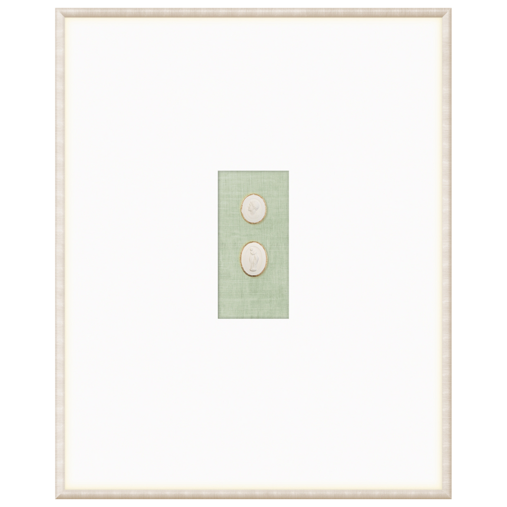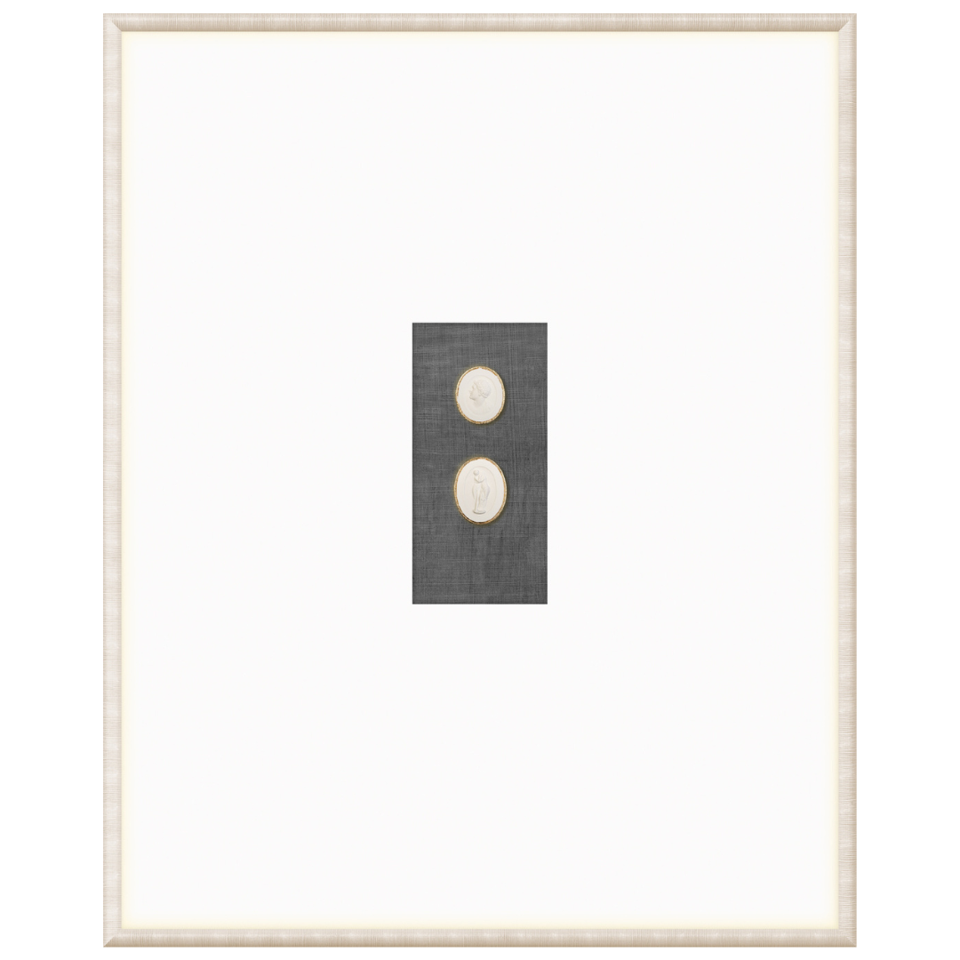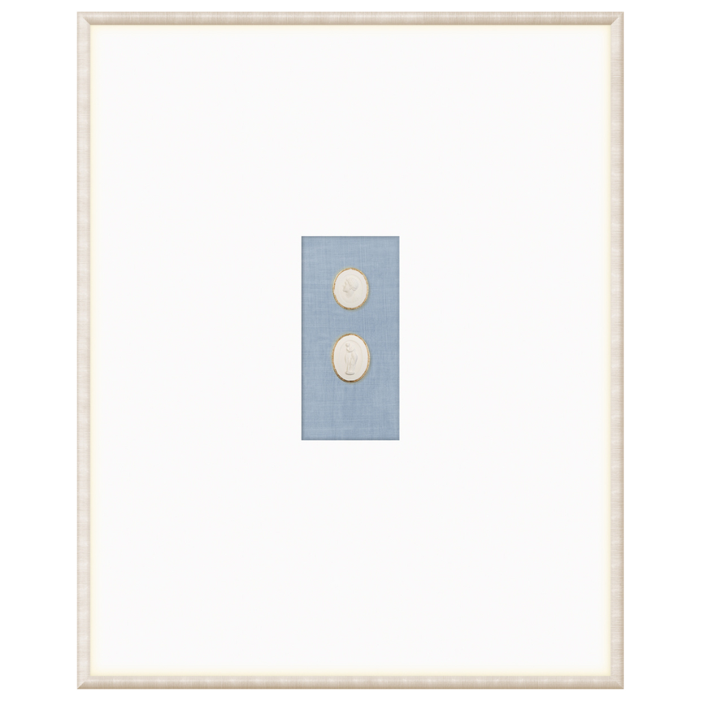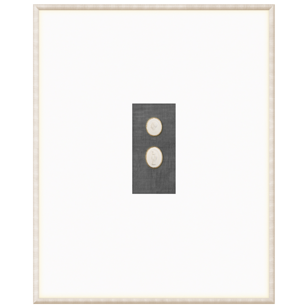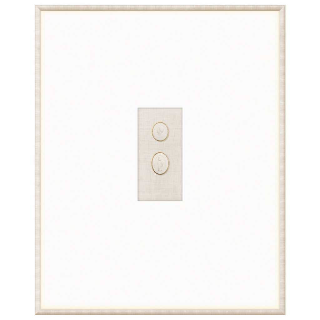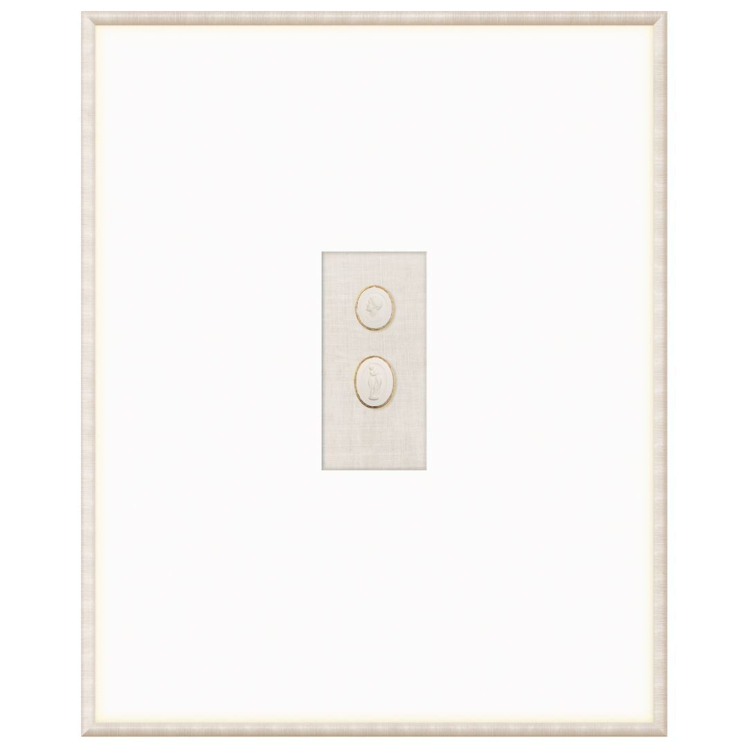 Our collection of Intaglios features both mythological and historical figures. Each one is hand-cast and gilded with fine gold filigree along the upper edge, framing the carved images and making them truly unique pieces. Each grouping is mounted on a linen texture background in a variety of colour options. They are framed in a light, neutral-toned moulding with a striated texture and a wide, raised matte with gilded framespace, giving them even more elegance and luxury. With our wide variety of arrangements and different combinations of Intaglios, you’re sure to find the perfect groupings for you.