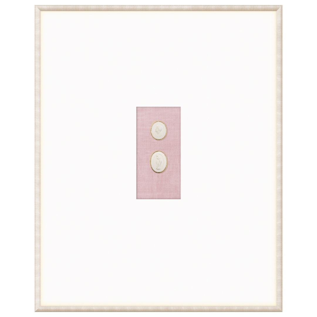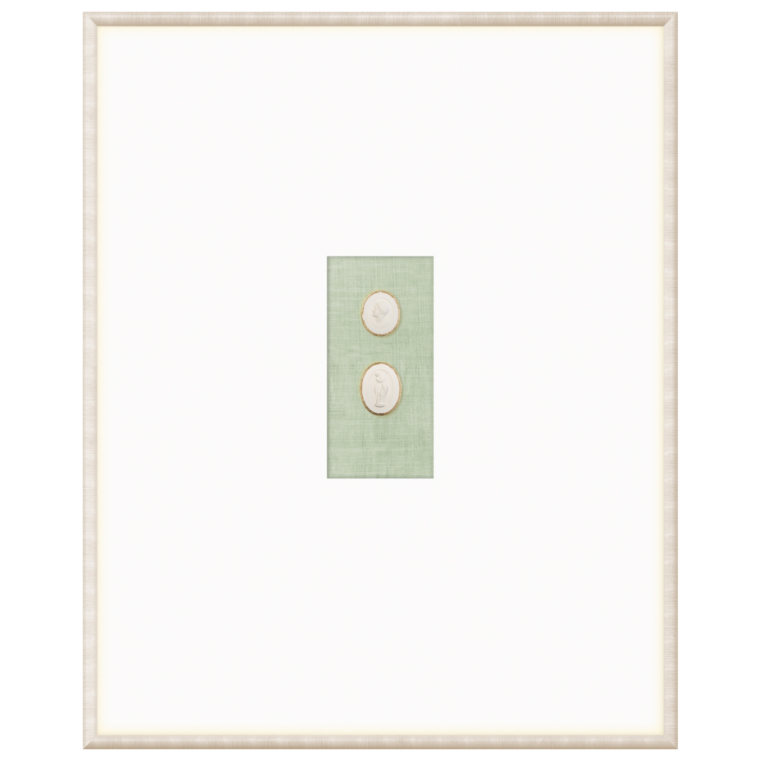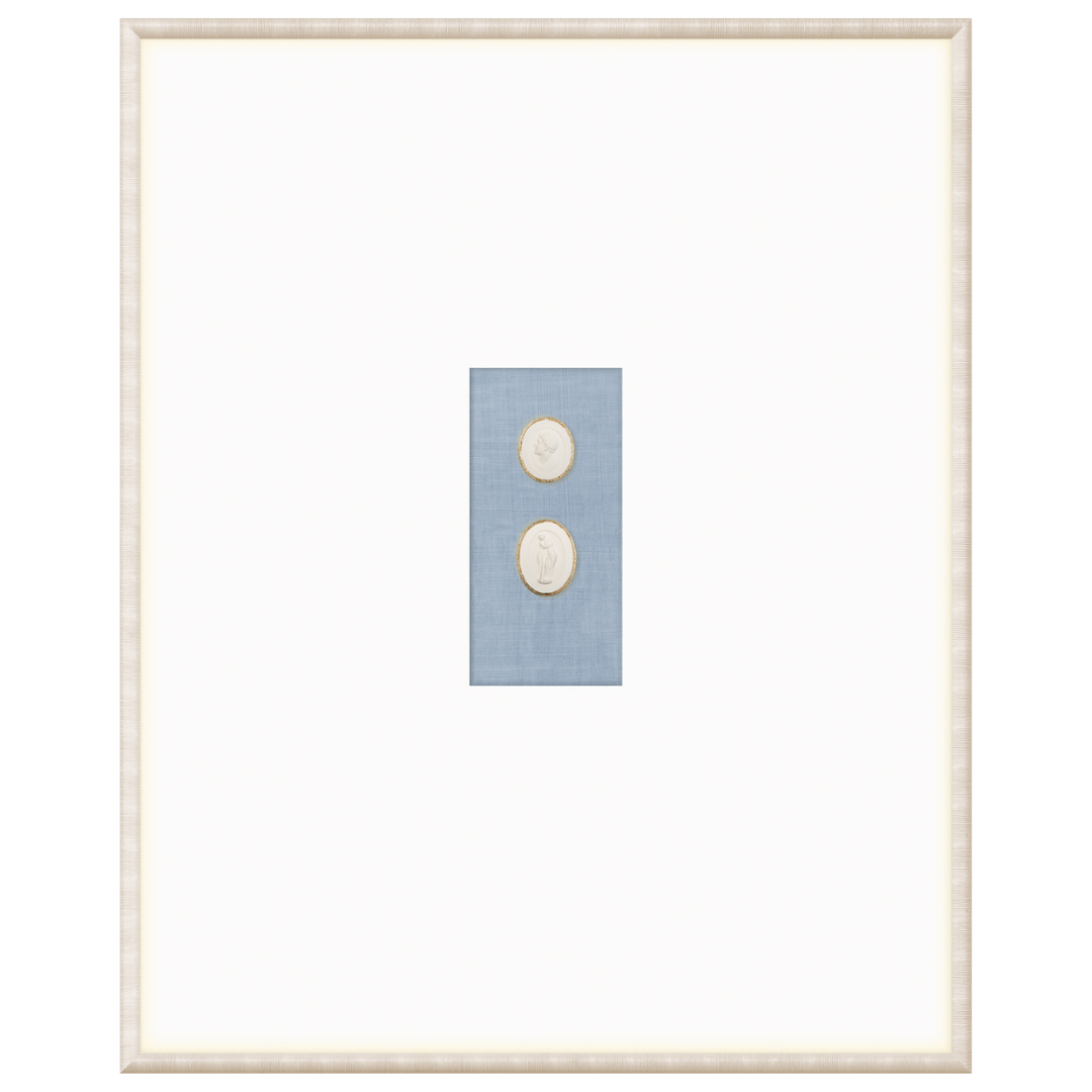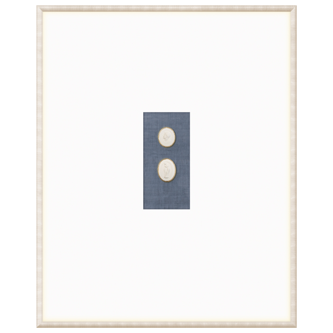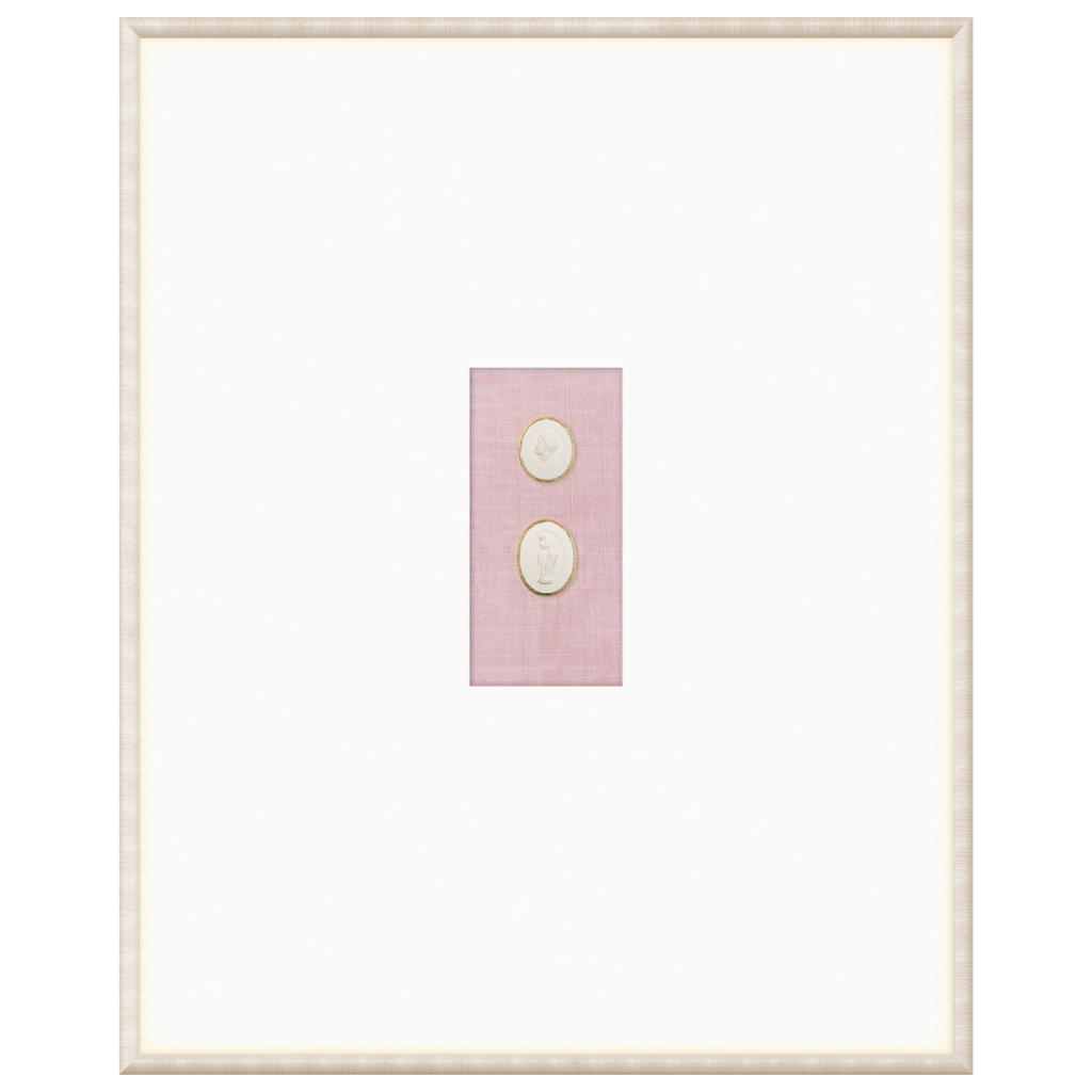 Our collection of Intaglios features both mythological and historical figures. Each one is hand-cast and gilded with fine gold filigree along the upper edge, framing the carved images and making them truly unique pieces. Each grouping is mounted on a linen texture background in a variety of colour options. They are framed in a light, neutral-toned moulding with a striated texture and a wide, raised matte with gilded framespace, giving them even more elegance and luxury. With our wide variety of arrangements and different combinations of Intaglios, you’re sure to find the perfect groupings for you.