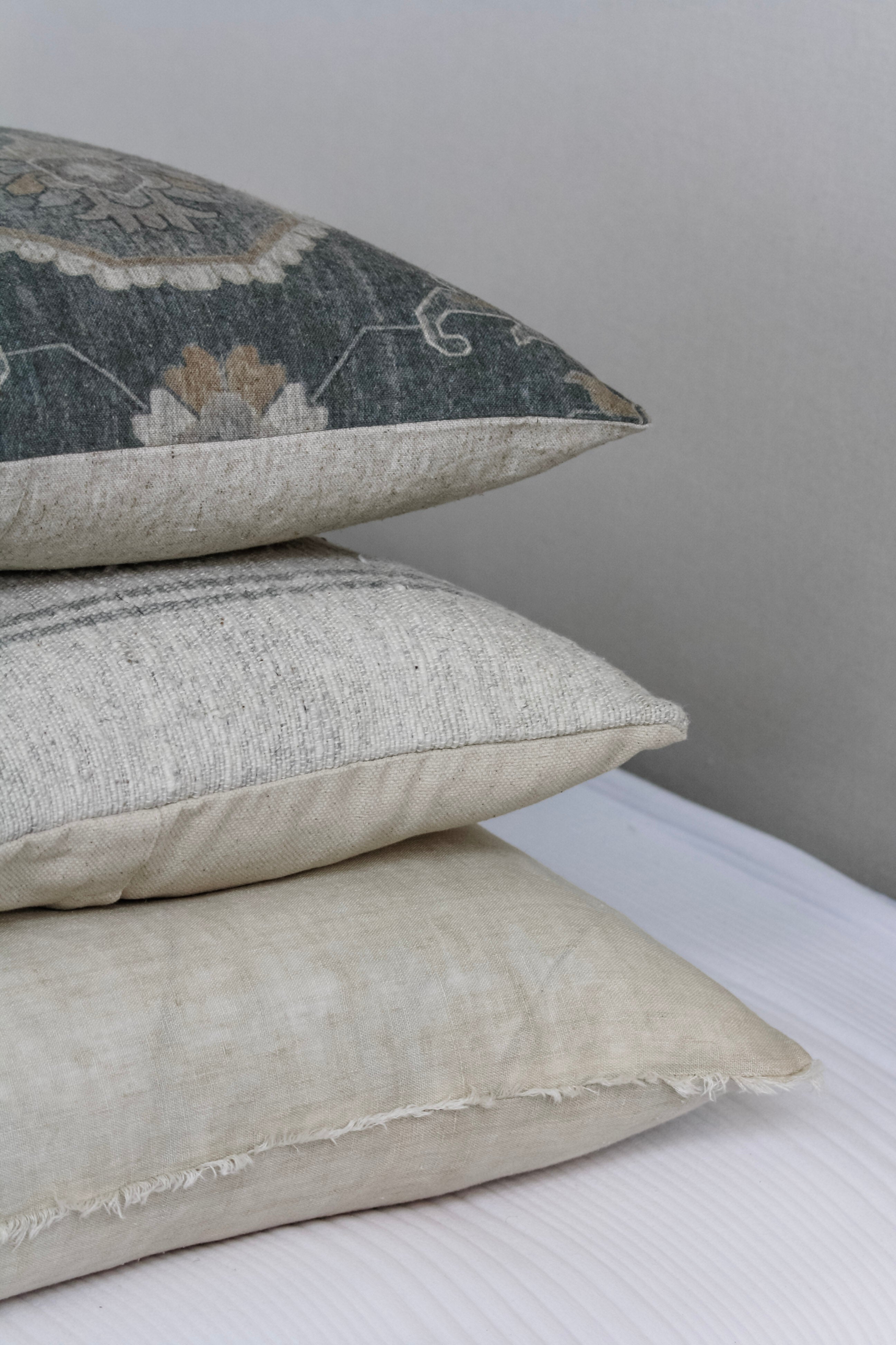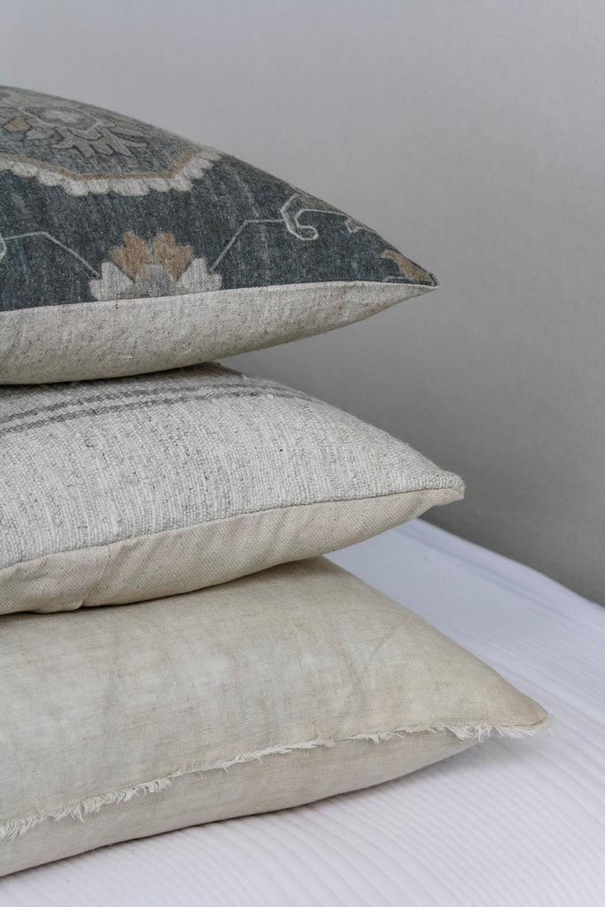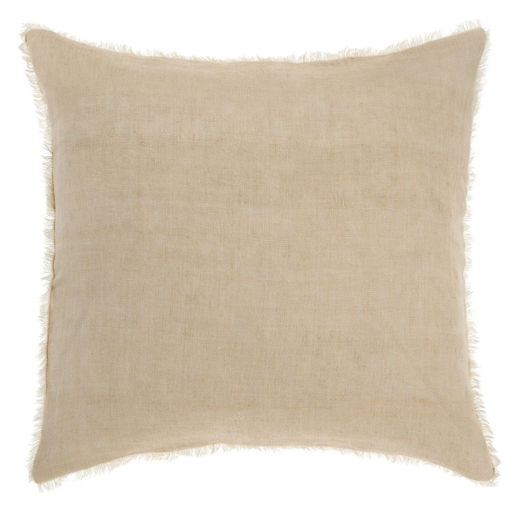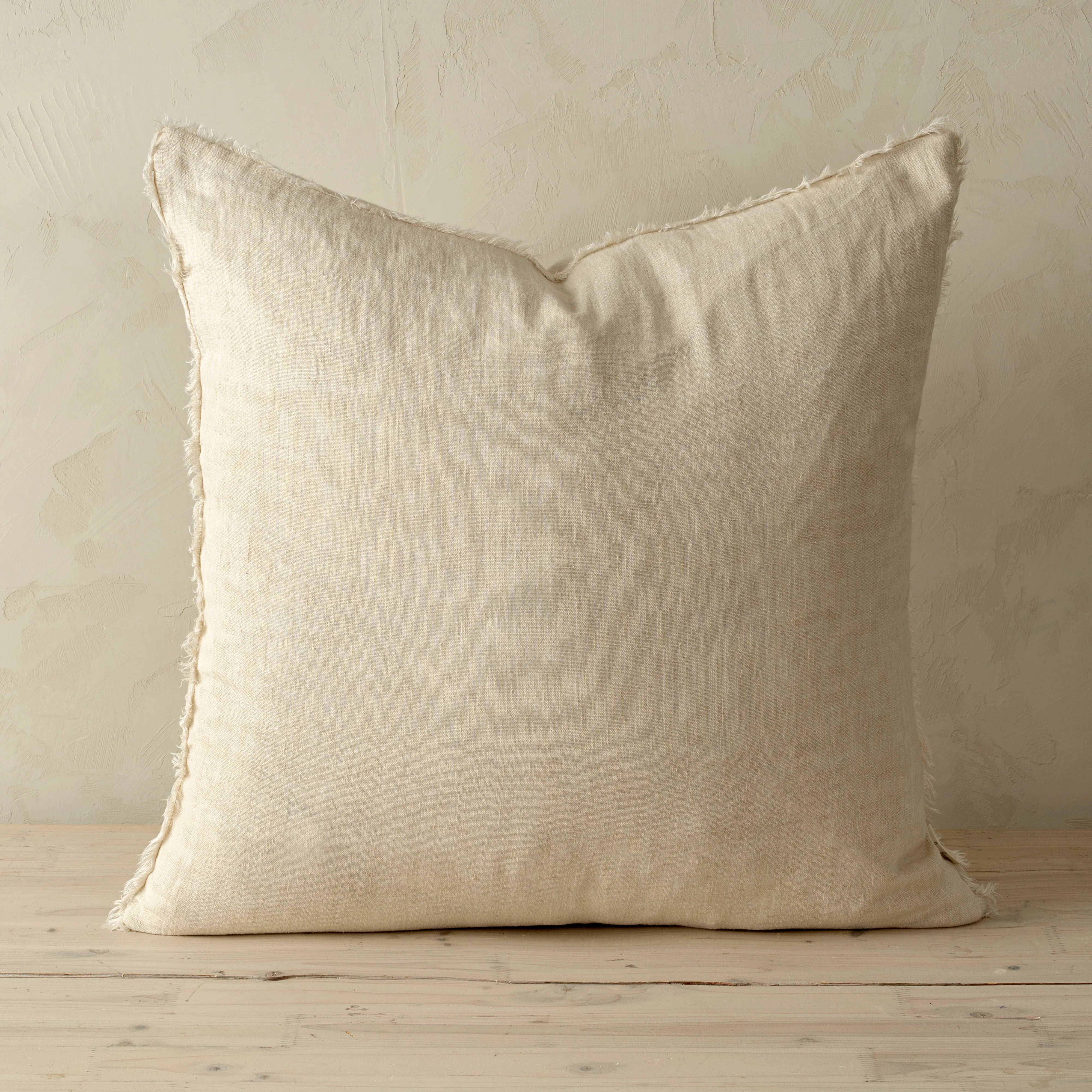 Classic linen is updated with a frayed edge, making them beautiful standalone cushions or backdrops for layering.