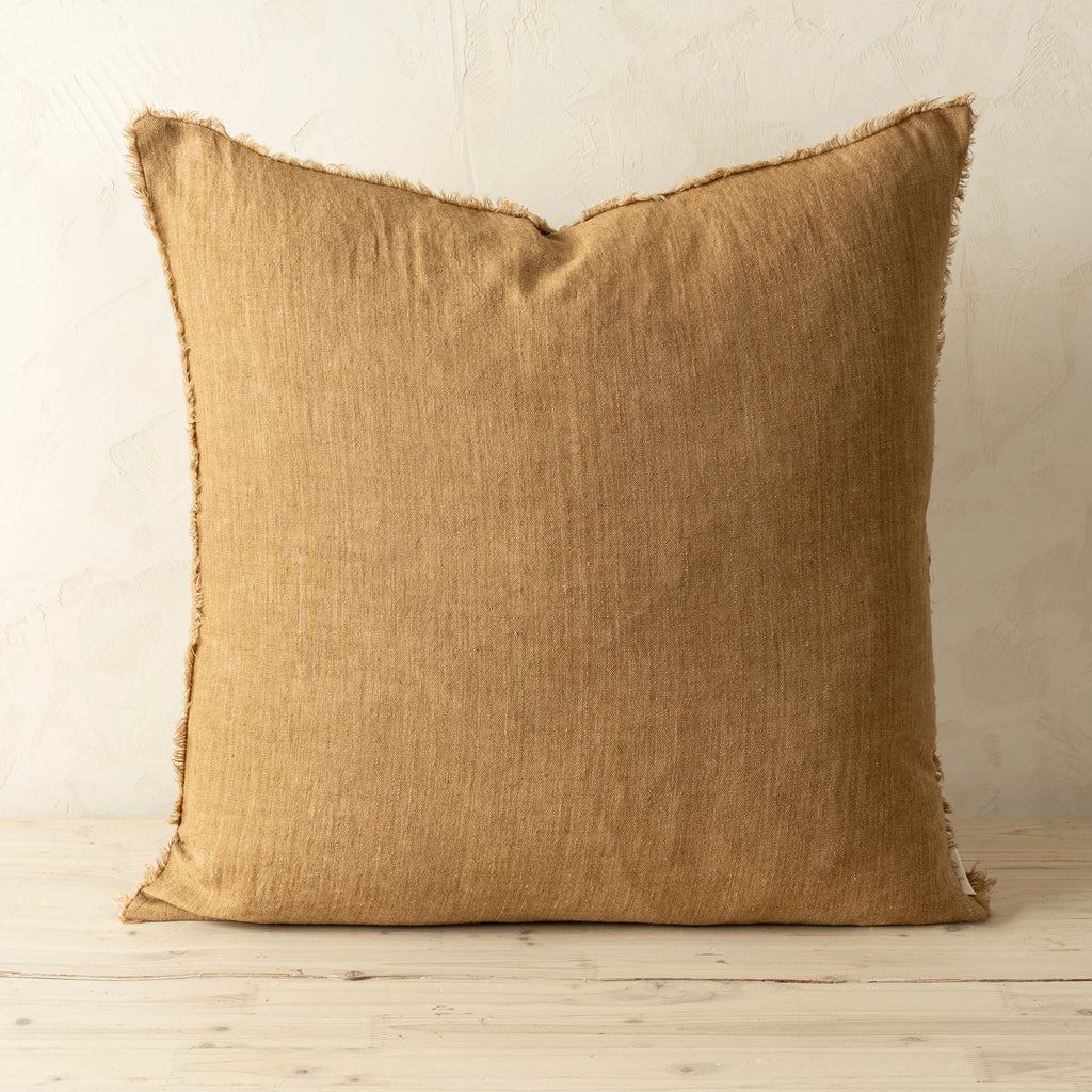 Classic linen is updated with a frayed edge, making them beautiful standalone cushions or backdrops for layering.