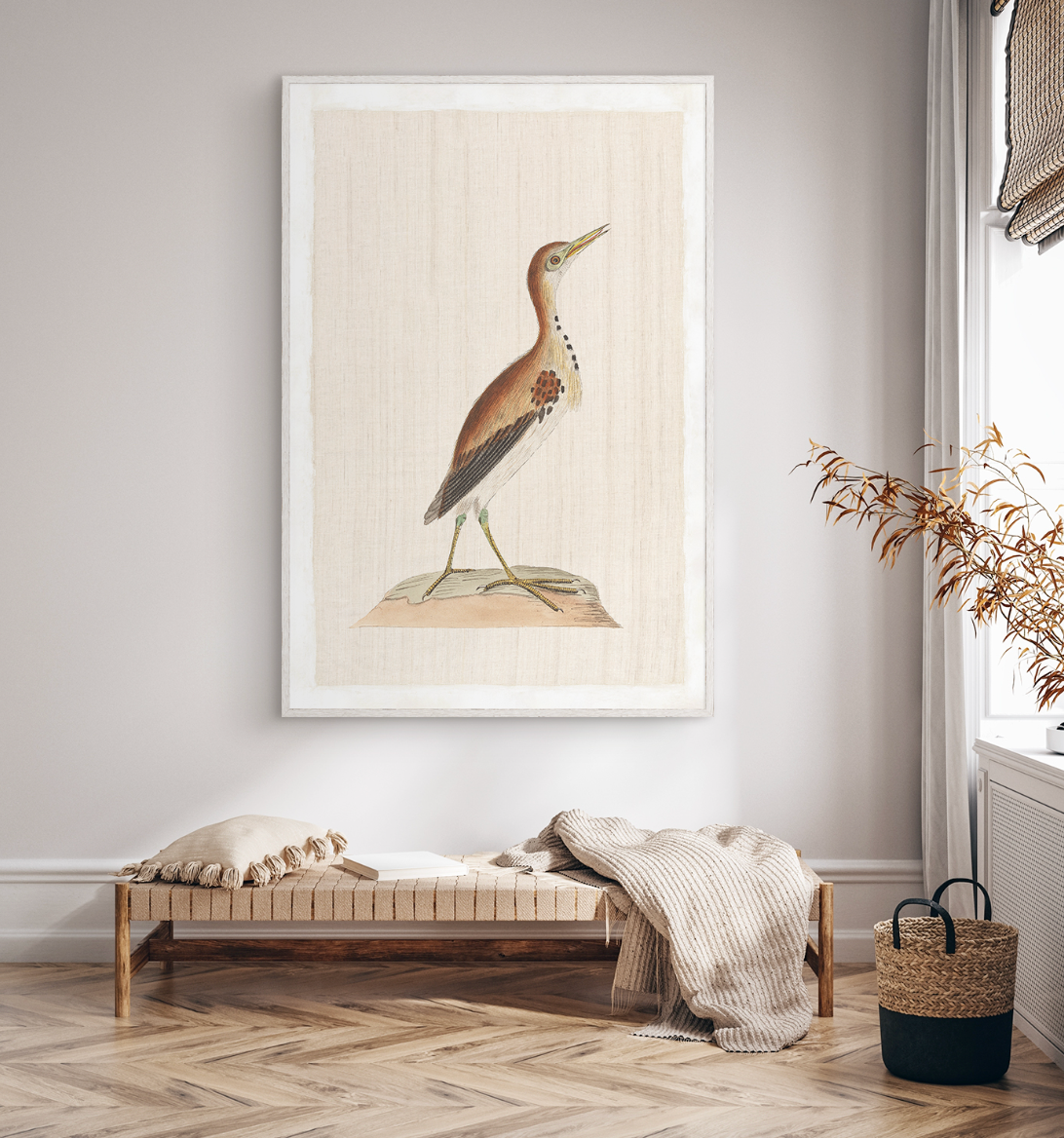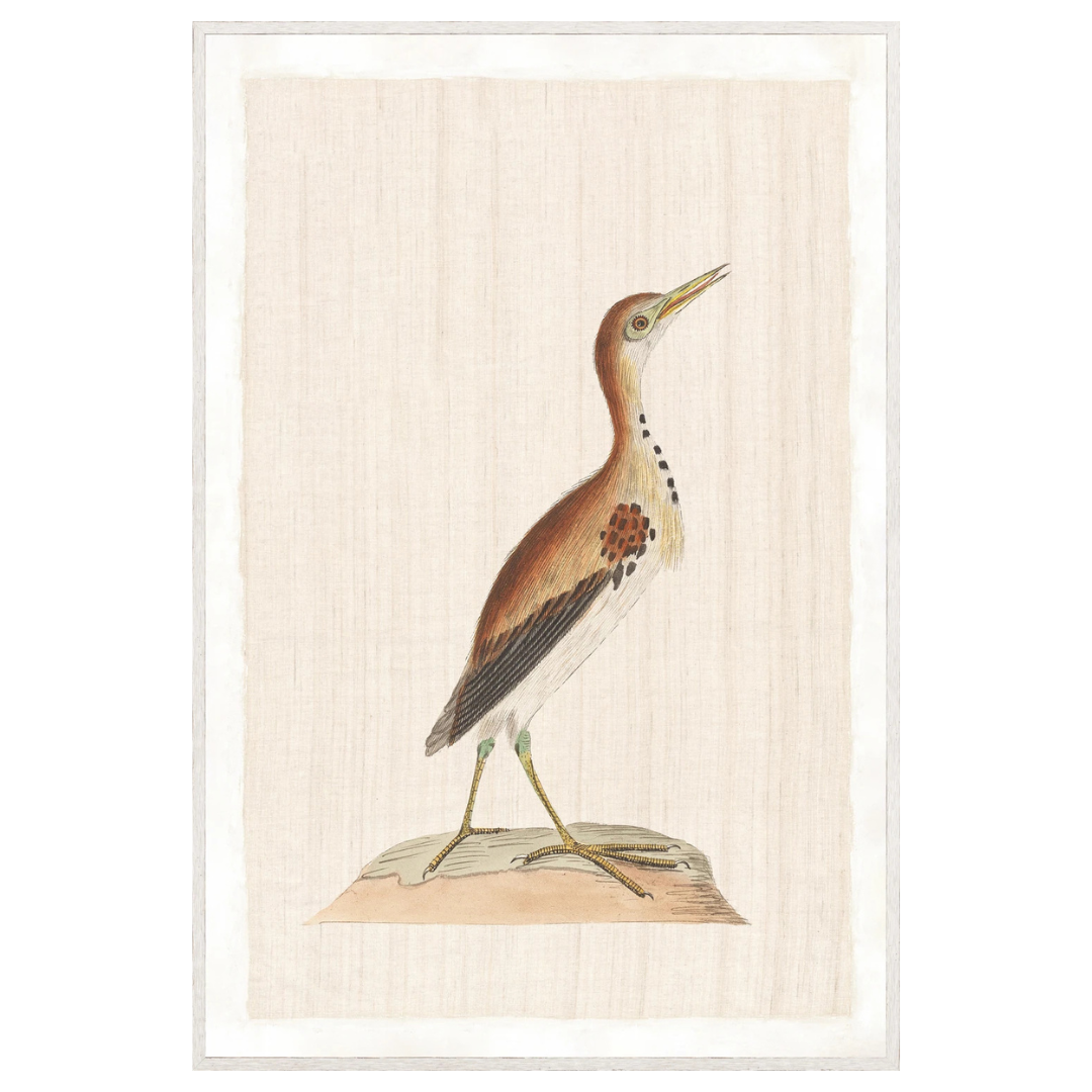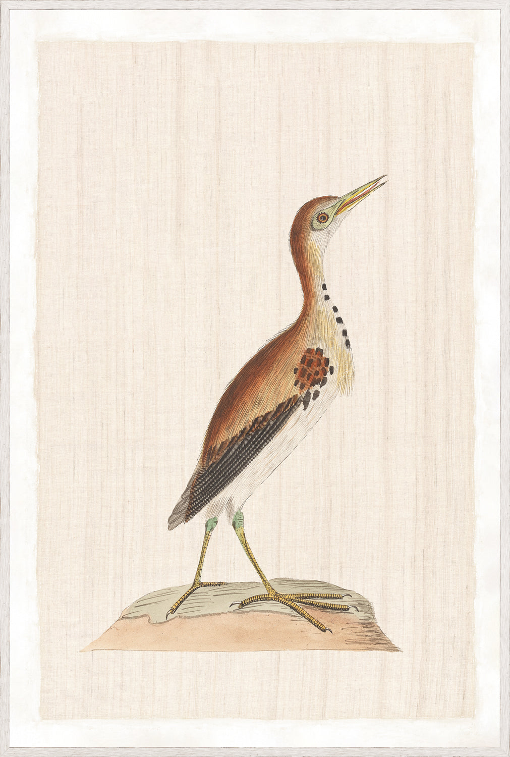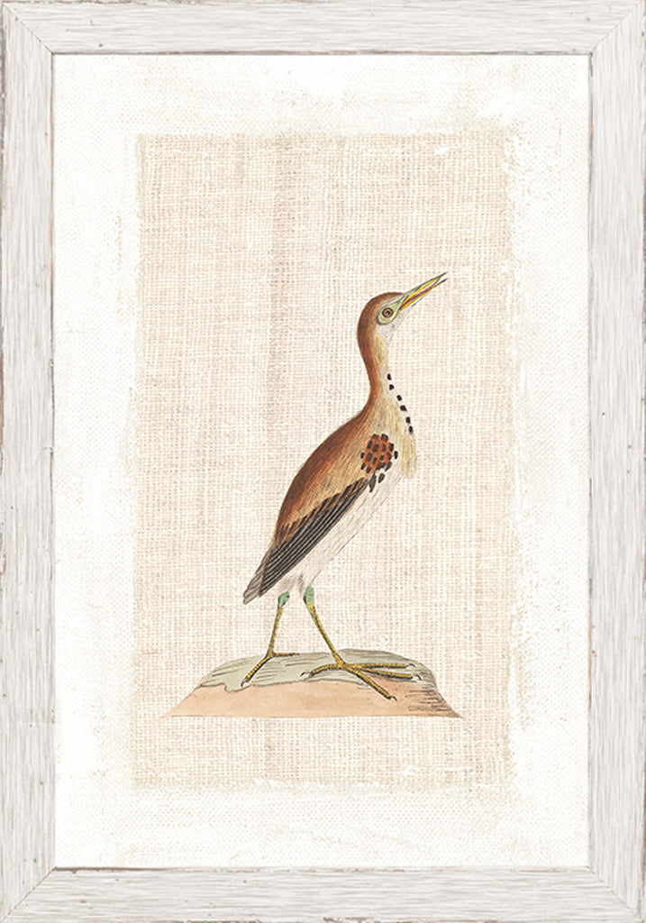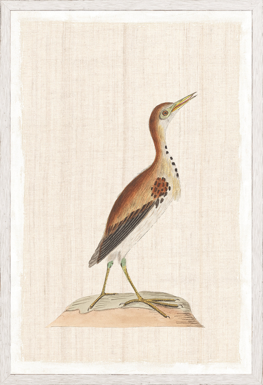 A large collection of beautifully detailed aquatic birds from the 1790s placed on a grass paper background and framed with our popular distressed white washed wooden moulding.