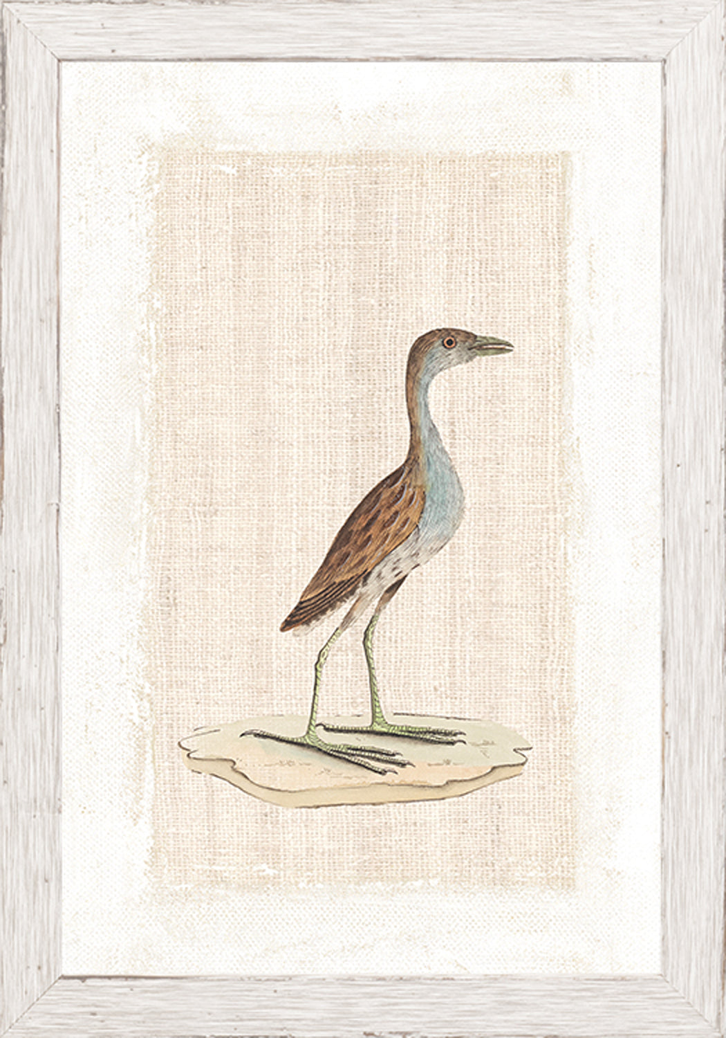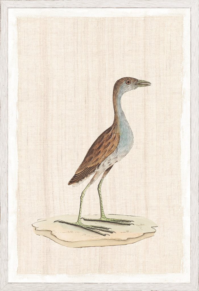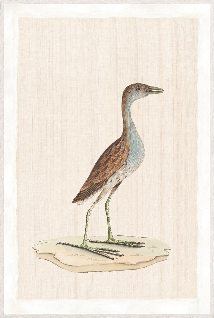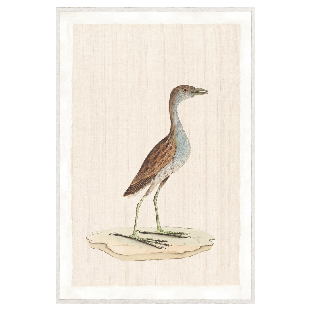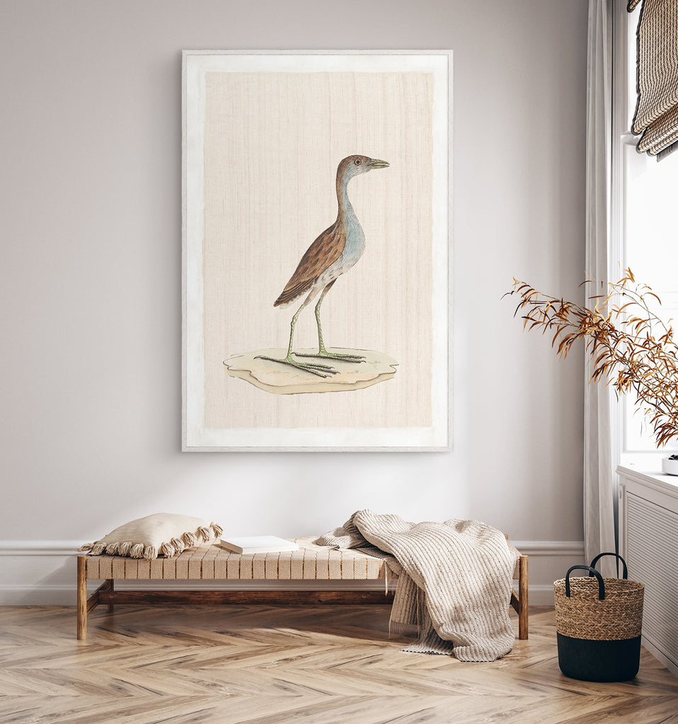 A large collection of beautifully detailed aquatic birds from the 1790s placed on a grass paper background and framed with our popular distressed white washed wooden moulding.