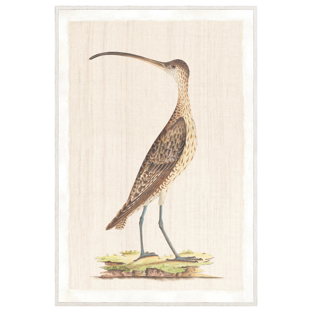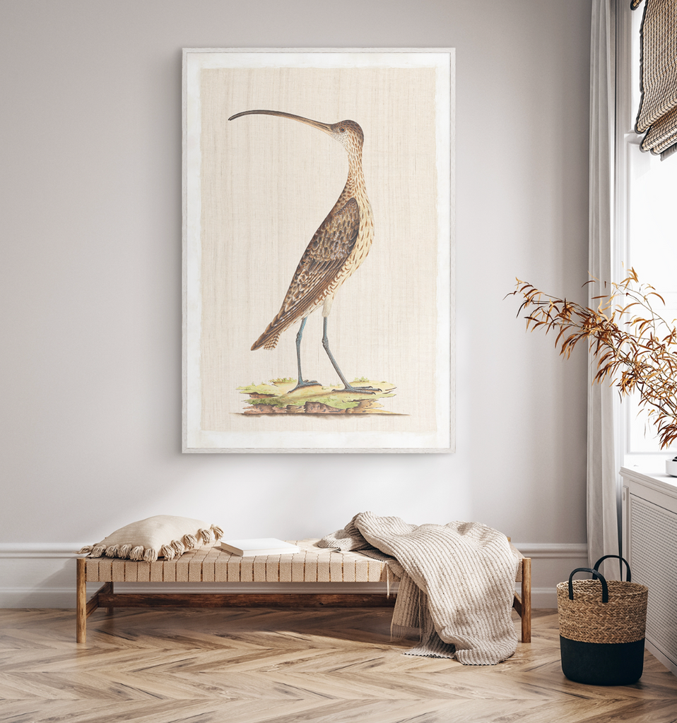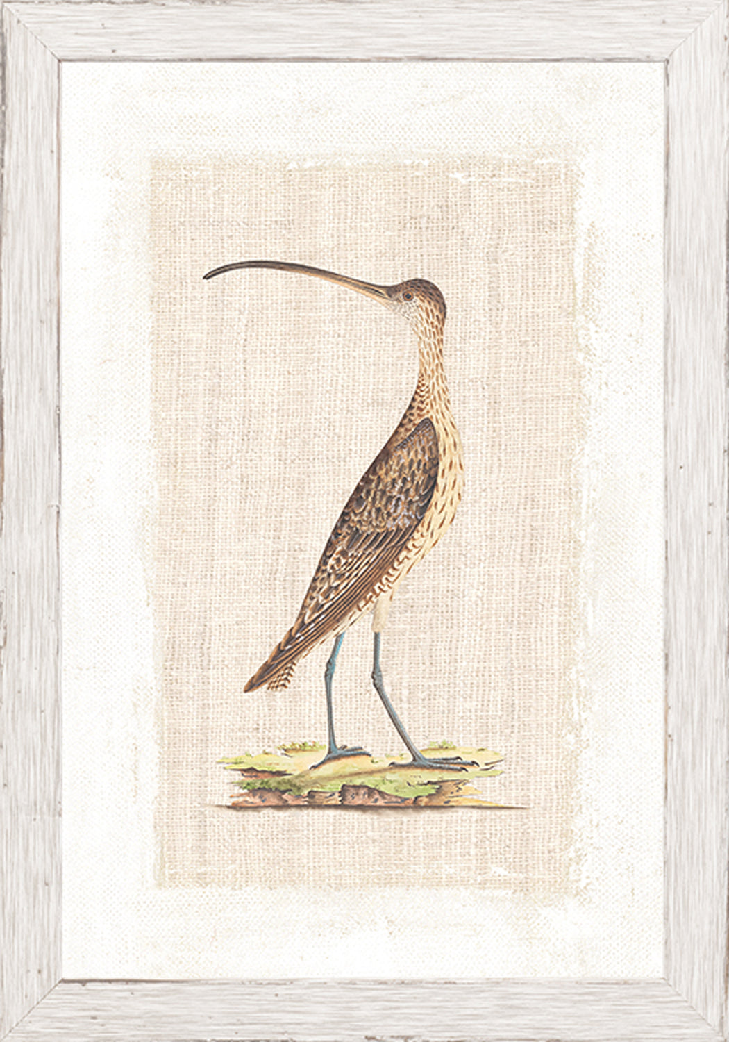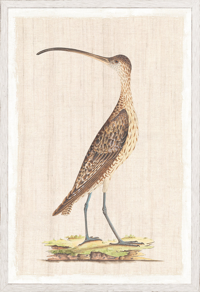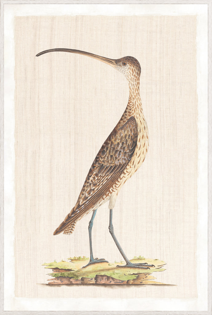A large collection of beautifully detailed aquatic birds from the 1790s placed on a grass paper background and framed with our popular distressed white washed wooden moulding.